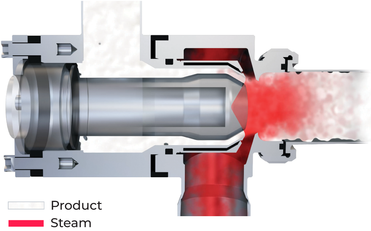 The most effective way of achieving rapid heating is to mix high-temperature steam directly with the product, followed by flash cooling in a vacuum vessel. This is called a direct system.