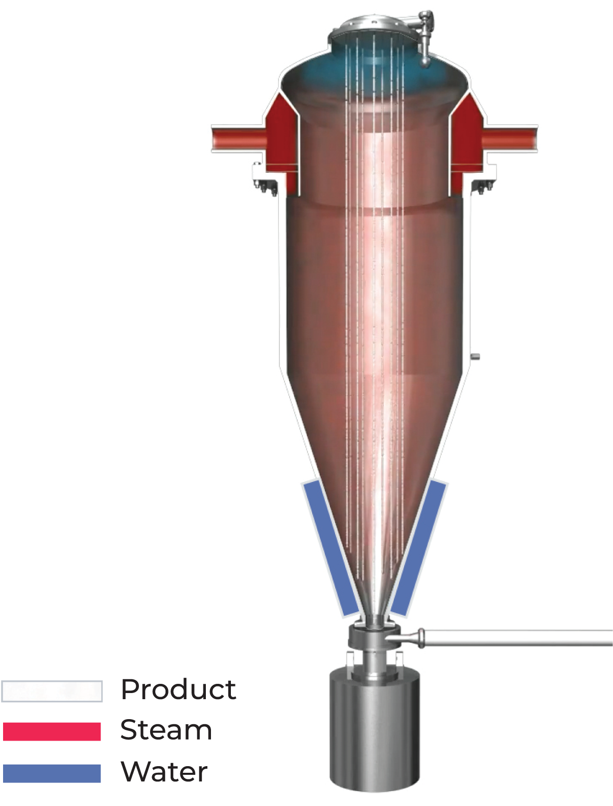 The basic principle of steam infusion is to heat a product by passing it through an atmosphere of steam, as shown in Figure 10.11. The product enters the infusion vessel at the top into a product-spreading system. In the product-spreading system, the product is distributed into small streams as it enters the infusion vessel and forms into droplets. As the droplets are falling down in the atmosphere of steam, the milk is heated up by condensations of steam at the surface of the droplets. The spreading system may vary between different infusion designs, but the resulting milk droplet size must be uniform so that the rate of heat transfer does not vary. If the droplet size varies, the infuser will depart from the theoretical model upon which the design is based.