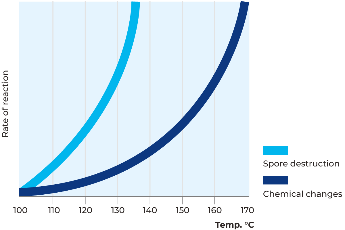 As mentioned above, the sterilising effect of heat treatment increases rapidly with increasing temperature. This, of course, also applies to chemical reactions occurring as a consequence of heat treatment. The Q10 value has been introduced as an expression of this increase in reaction speed. Q10 states how many times the speed of a reaction increases if the temperature of the system is raised by 10 °C.