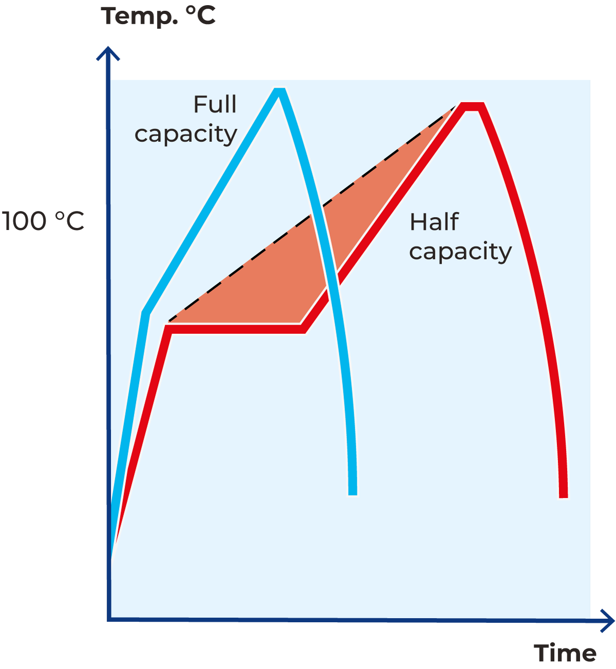 The time/temperature curves in Figure 10.20 show the difference in the heat load on the product at nominal and half capacity. The dotted line on the graph represents the temperature development in a system without split heating facilities running at 50% of nominal capacity.