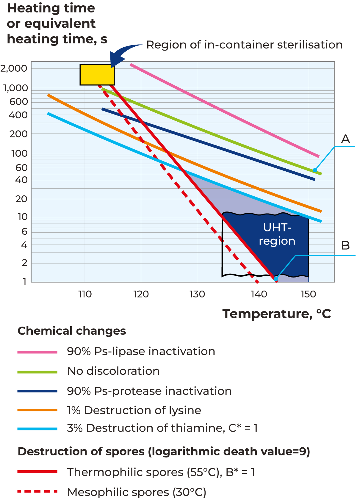 Figure 10.4 shows the relationship between the sterilising effect and the browning reaction in milk. Line A represents the lower limit of time/temperature combinations that cause the milk to turn brown. Line B is the lower limit of combinations for commercial sterility (B* > 1, destruction of thermophilic spores). The regions for in-container sterilisation and UHT treatment are also marked in the figure.