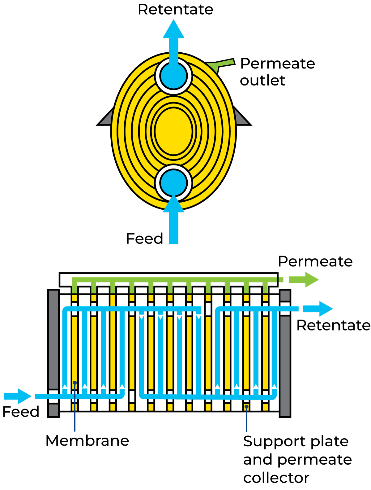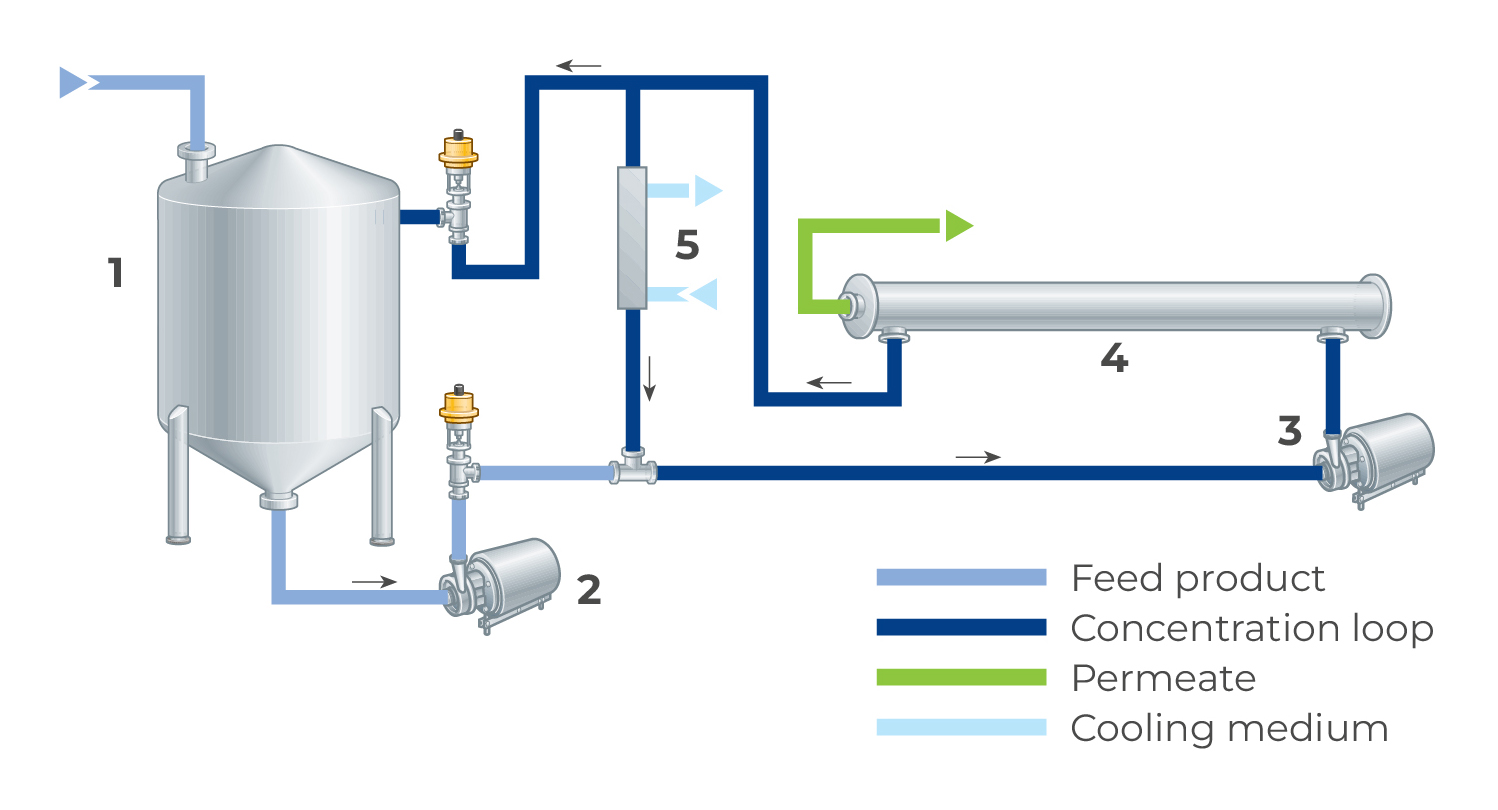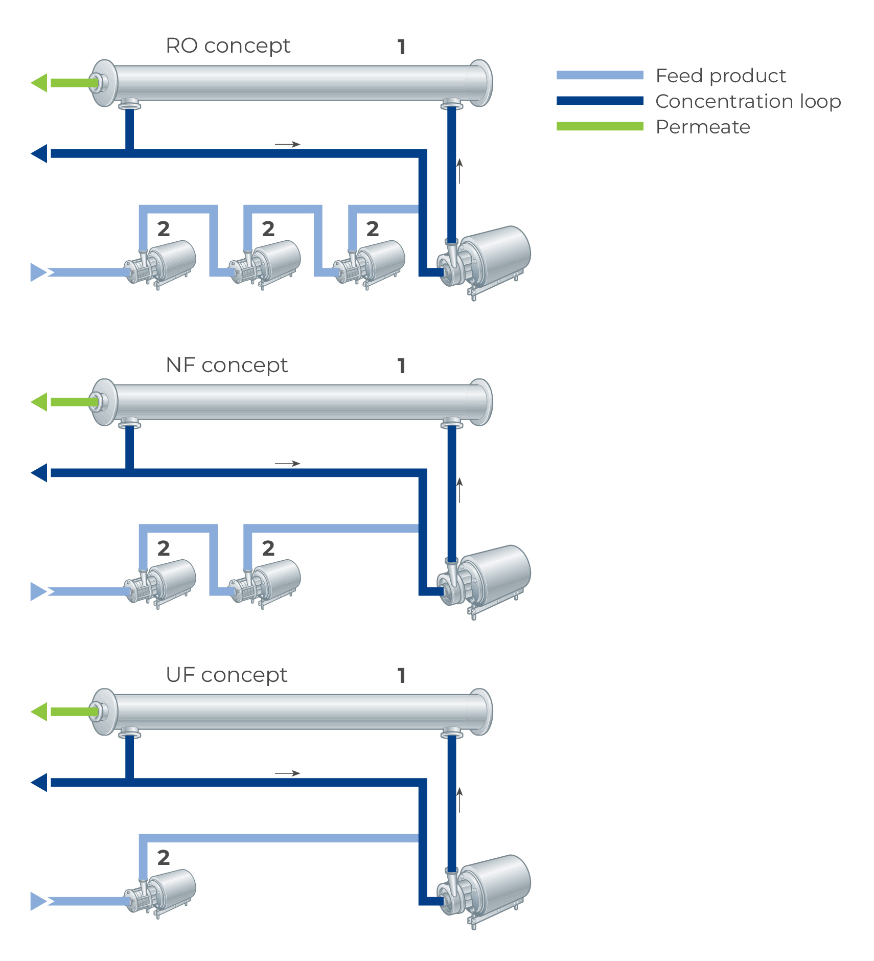 The other filtration spiral-wound systems, NF, UF and MF, have more open membranes and can therefore be managed with two feed pumps and one feed pump, respectively. As was mentioned earlier, the ceramic MF concept is based on two filter modules operated in series in a filter loop system that also has one centrifugal pump for circulation of the retentate and one for circulation of the permeate.