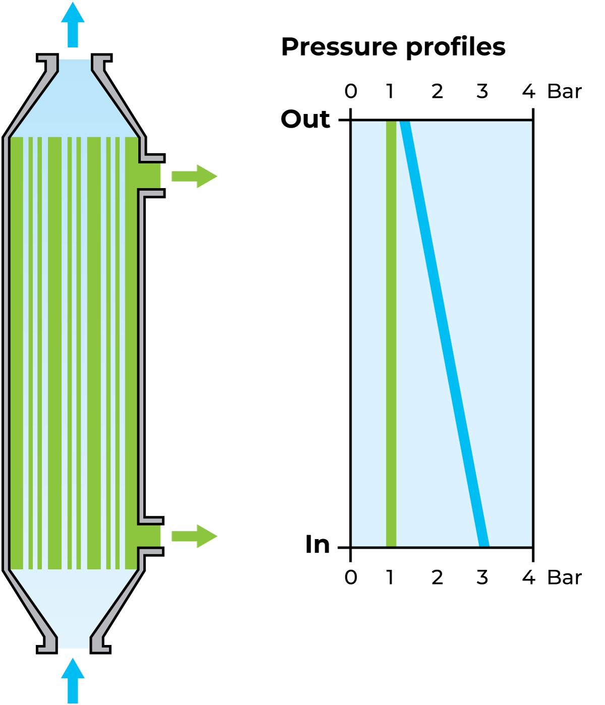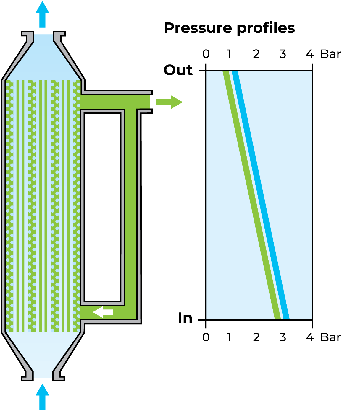 Today, specially designed membrane elements are available that have this UTP system built into their structure. When using this type of membrane, there is no need for circulation on the permeate side. These membranes are called gradient pressure (GP) membranes and have a flow resistance which differs along the element.