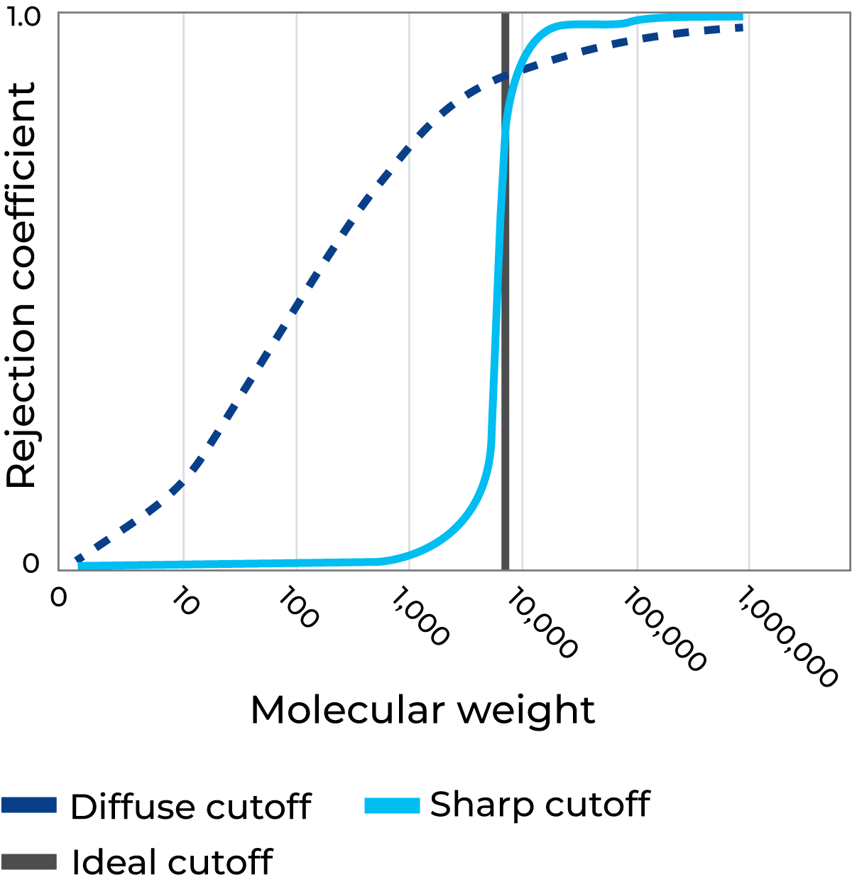 Membranes with a narrow pore size distribution let everything with a definite lower molecular weight permeate, while membranes with a wide pore size distribution let some material with a higher molecular weight permeate and reject some with a lower molecular weight, although the two membranes are defined as having the same molecular weight cut-off.
