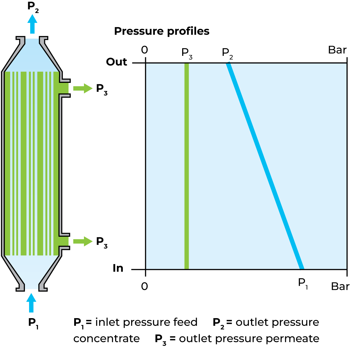 The higher the velocity through the module, the higher the value of ΔP. A higher velocity results in a higher shear at the membrane surface and a lower polarisation effect. However, there are constraints such as the membrane's resistance to pressure and the price of pumps capable of delivering both high flows and high pressure.
