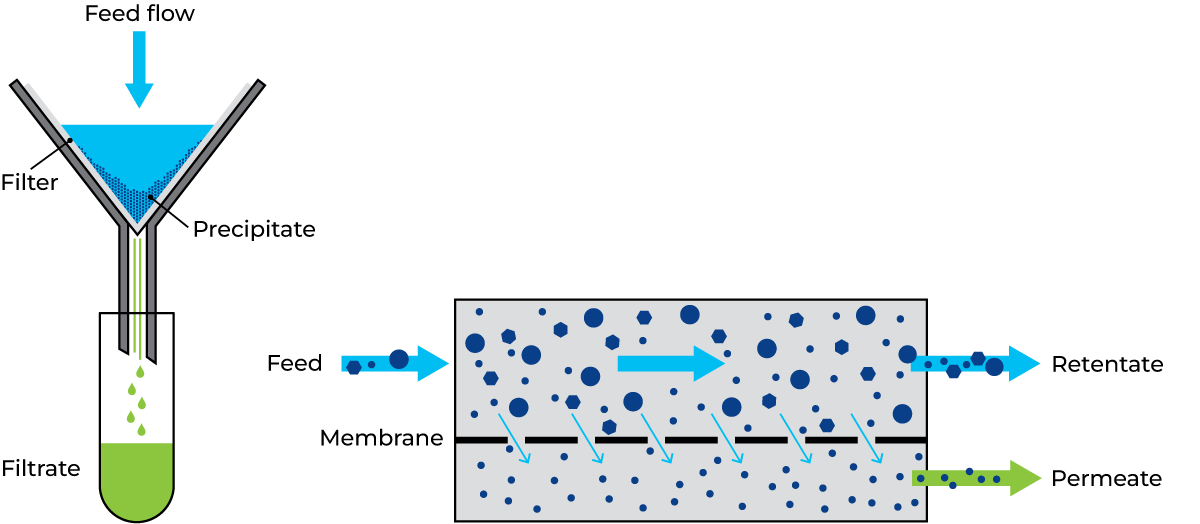 It should be mentioned that traditional filtration, which is operated in dead-end mode, like in a typical coffee filter, is typically used for the separation of suspended particles larger than 10 μm, while membrane filtration separates substances with molecular sizes less than 10 μm. Traditional filtration is performed in a dead-end mode, while membrane filtration is performed in both dead-end and cross-flow modes. The basic difference between traditional filtration and cross-flow membrane filtration is illustrated in Figure 7.4.2.