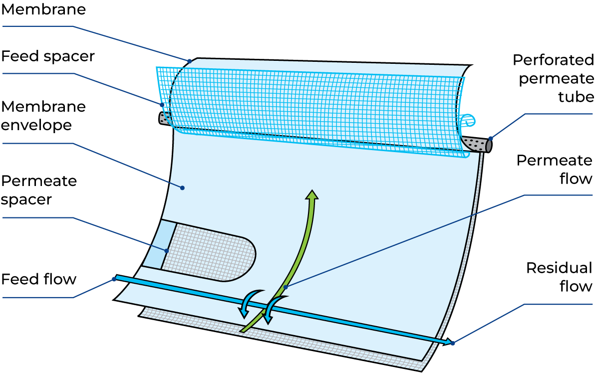 A plastic mesh with a diamond parallel design, known as the feed spacer, serves as a channel for the flow of feed solution through the system and is placed in contact with one side of each membrane envelope. Due to the mesh design, the feed spacers also act as turbulence generators, optimising the flow conditions at the membrane surface during production and cleaning, which helps to keep the fouling and concentration polarisation under control.
