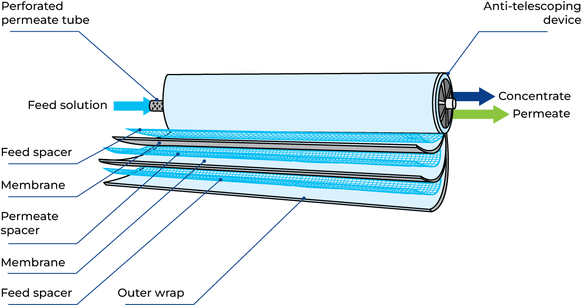 The feed solution must not contain coarse particles, which can damage the very thin filtration layer/active layer or get irreversibly stocked in the membrane spacer, thereby impairing the flow. For this reason, a fine-meshed strainer is often integrated into the feed system.