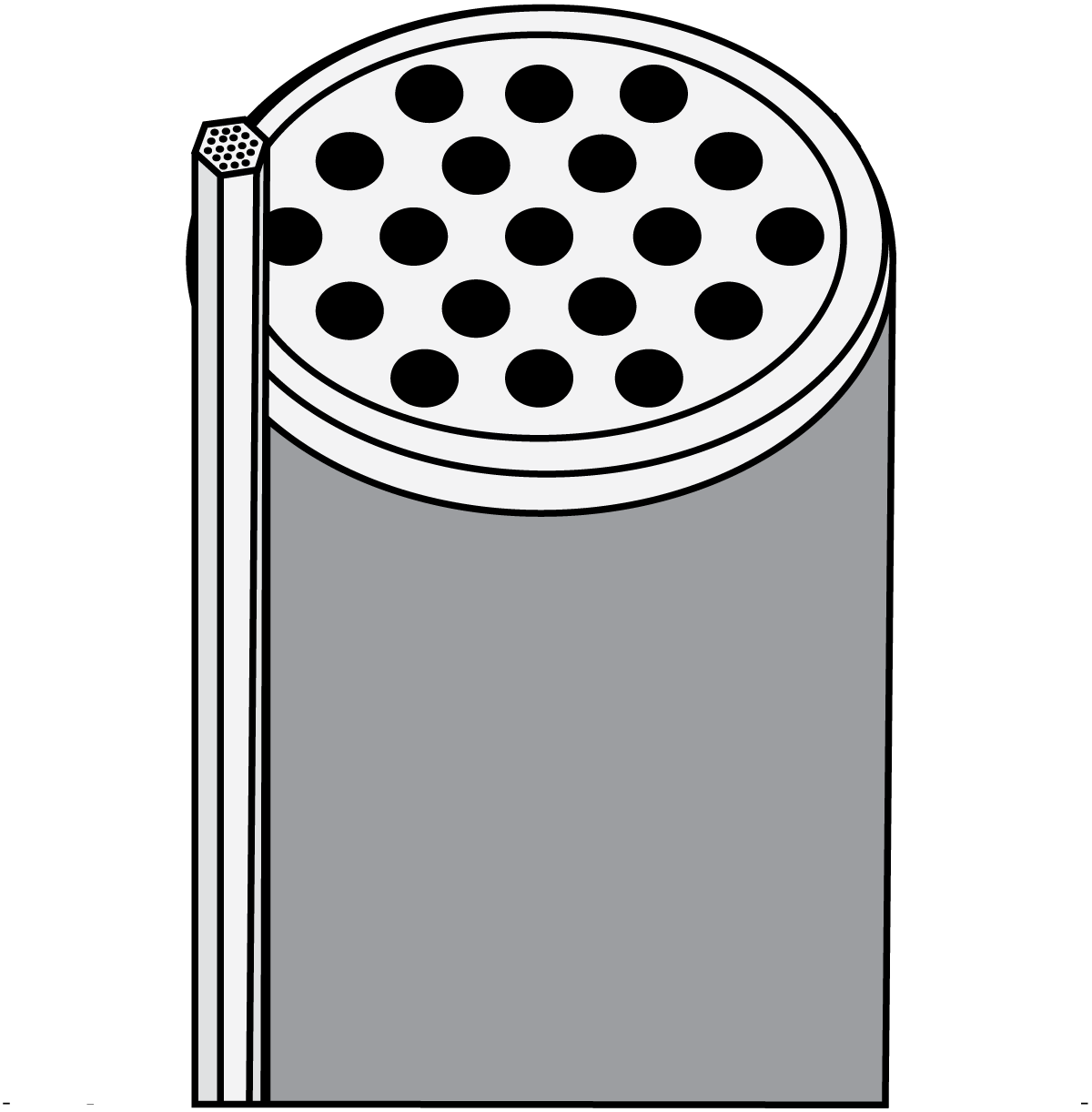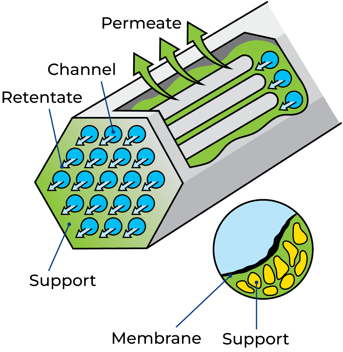 The filter element (Figure 7.4.7) is an example of a ceramic membrane element. The thin walls of the channels are made of fine-grained ceramic and constitute the membrane. The support material is coarse-grained ceramic.