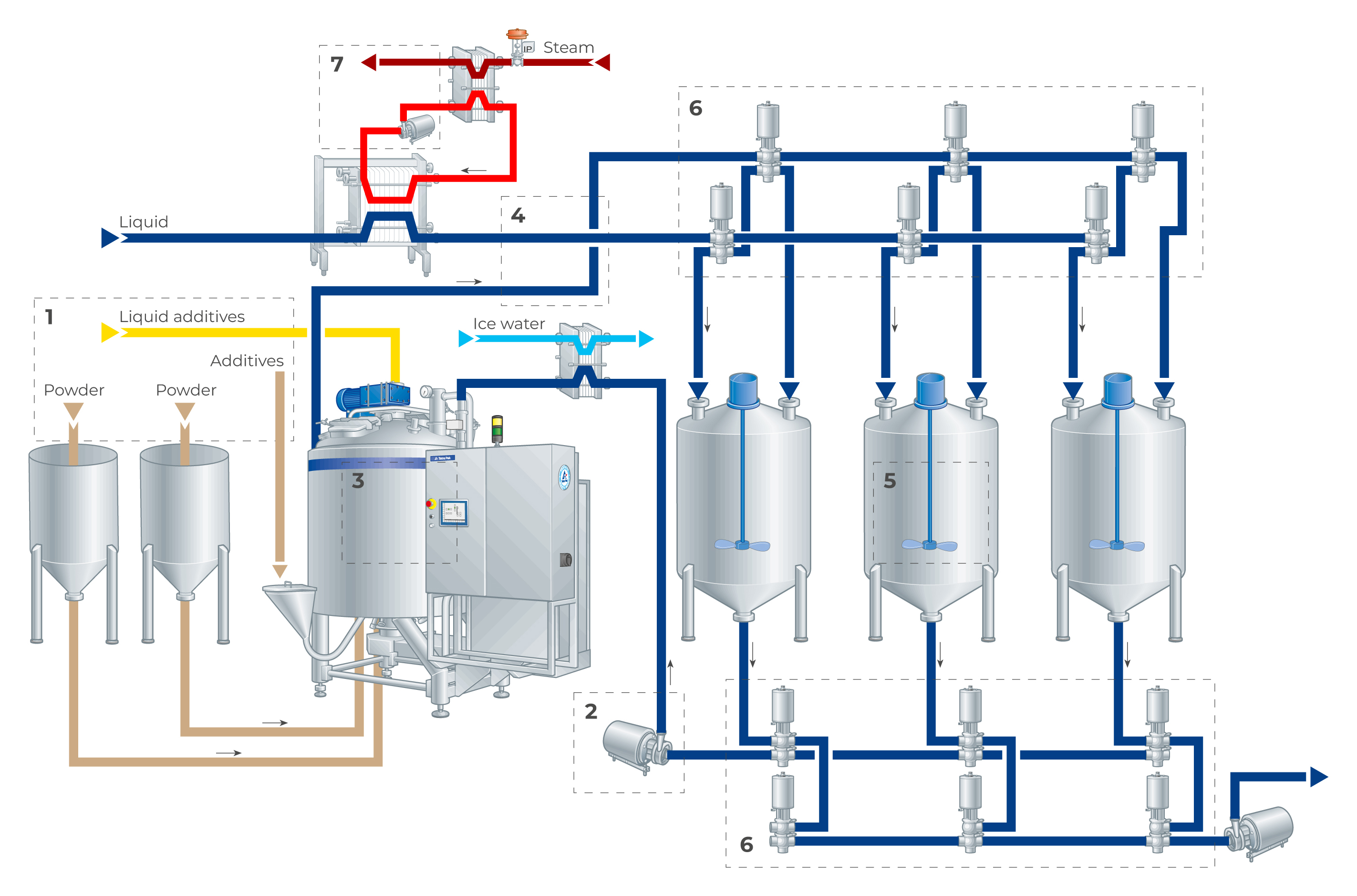 There are many different mixing duties in dairy production, ranging from adding sugar and milk powder to milk to incorporating fruit preparation into yoghurt or preparing stabiliser slurries. The choice of what mixer to use as well as how to set up the mixing line will depend on the type of ingredients to be mixed, product quantity, investment cost and flexibility in terms of mixing intensity, and the required product range.