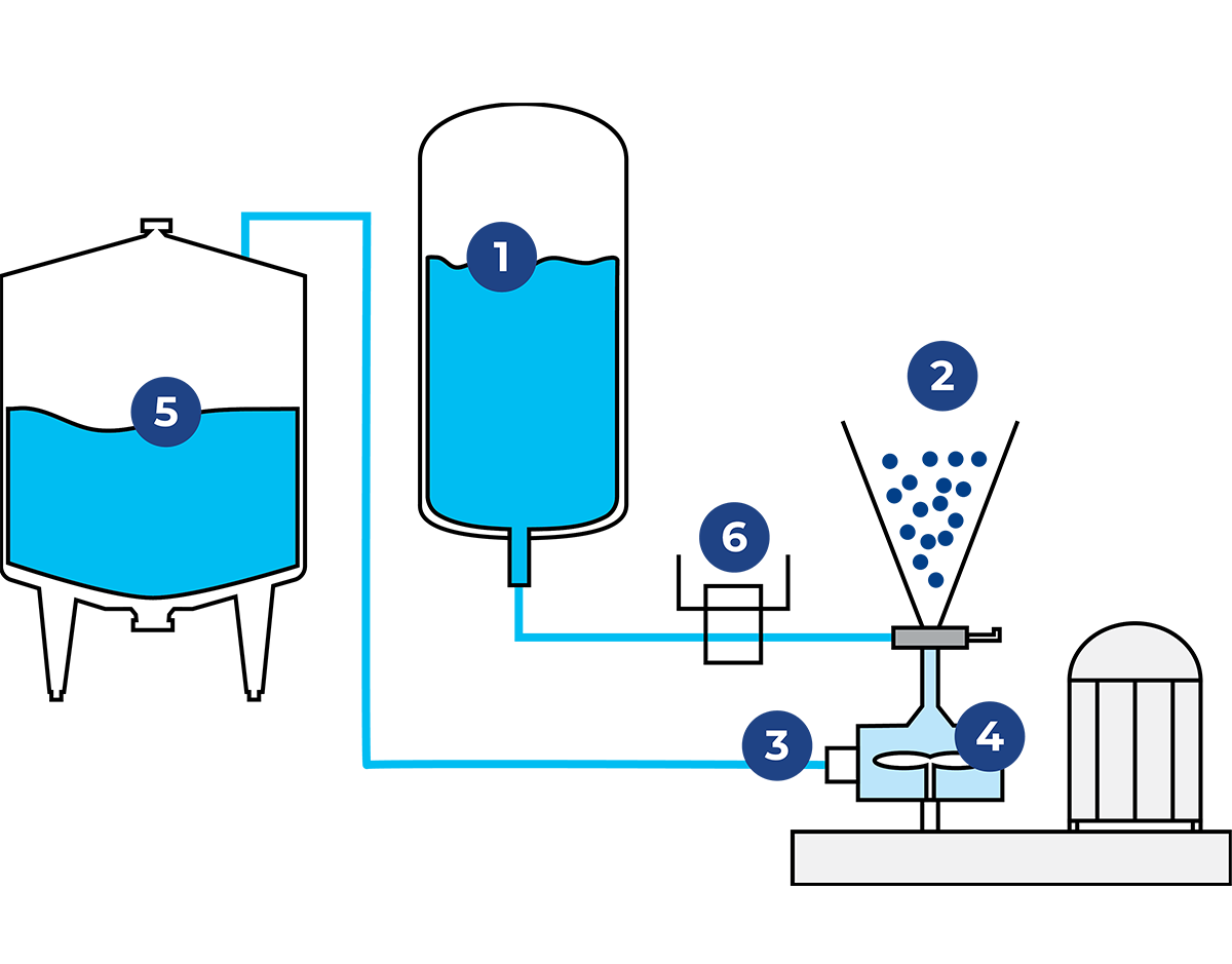 Figure 7.5.9 shows a line setup for recirculation mixing. The bulk of the liquid is added to the designated recirculation tank (5) and is circulated over the rotor-stator mixer (2, 3, 4). Powdered and or liquid ingredients are added (1) directly into the rotor-stator mixer (3). When in the mixer, the ingredients are dispersed by the mixing head and are circulated over the recirculation tank.