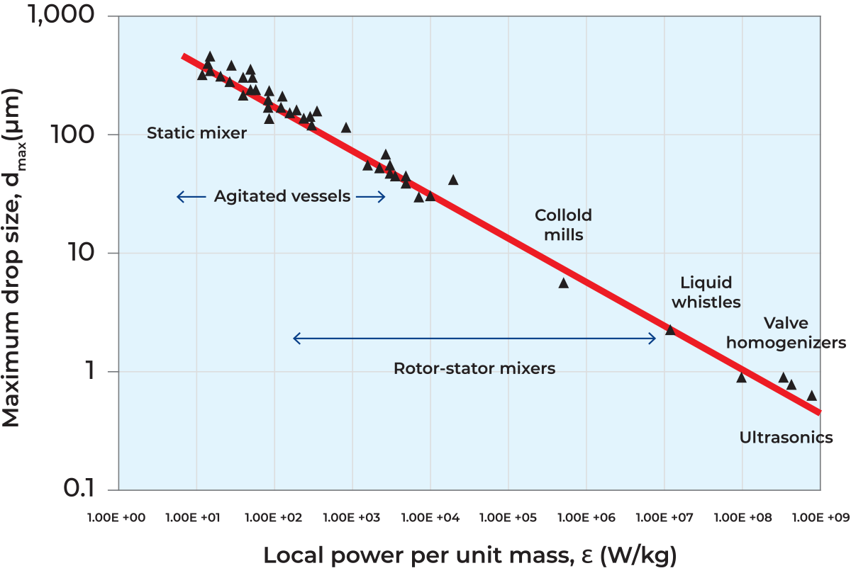 Where P (unit: kgm2s-3 or W) is the power input, V is the liquid volume and ρ is the density. So, by simply knowing the kinematic viscosity, the power input from the mixer unit and the liquid mass it is distributed in, it is possible to estimate the maximum size of undissolved powder or fat droplet. For a high-shear mixer, this is normally in the range of 1 – 10 μm. An overview of the effect with different mixing equipment is shown in the plot below.