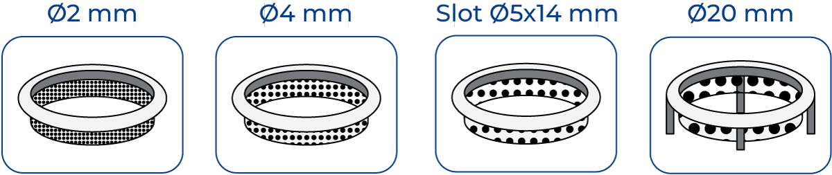Fig. 7.5.7 Stator designs with varying pore sizes to influence shear force and flow properties produced in a rotor-stator mixer.
