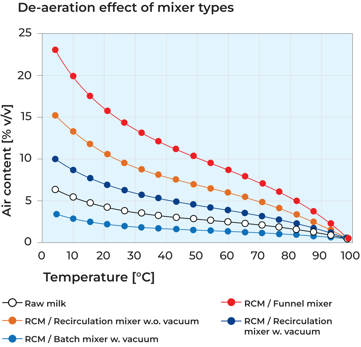 To remove air from the product it can be useful to mix under low pressure, also known as vacuum mixing. A high vacuum is pulled in the mixer tank as this increases the air bubble size, facilitating the bubble breakage, and removal from the product. It is even possible to lower the pressure to below boiling point, facilitating a very fast de-aeration of the product. Figure 7.5.8 shows the de-aeration effect by various mixer types and how the air content of the final product (recombined milk) can be on the same level (or even a lower level) as fresh raw milk in the receiving tank.