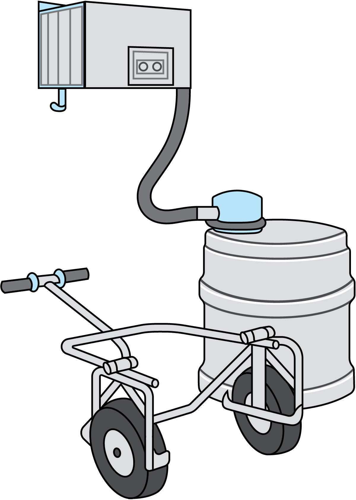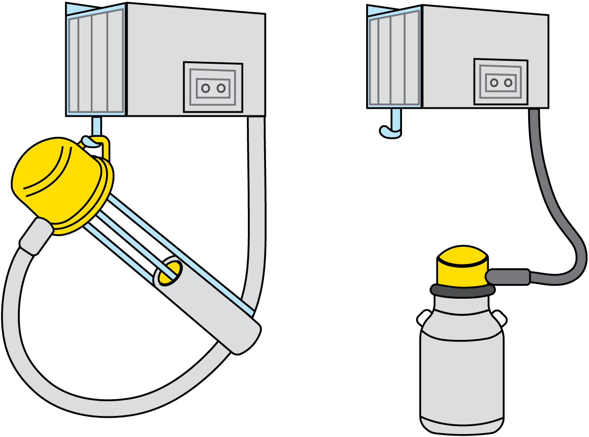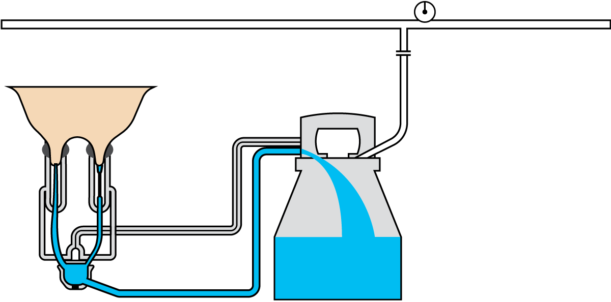 The four teat cups, attached to a collector called the milk claw, are held on the cow’s teats by suction and the friction between the teat and the teat cup liner. Vacuum is alternately applied (alternate pulsation) to the left and right teats or, in some instances, to the front teats and rear teats. The applying of vacuum to all four teats at the same time (simultaneous pulsation) is less common. The milk is drawn from the teats directly to the milk pail or via a vacuum transport pipe to a receiver unit.