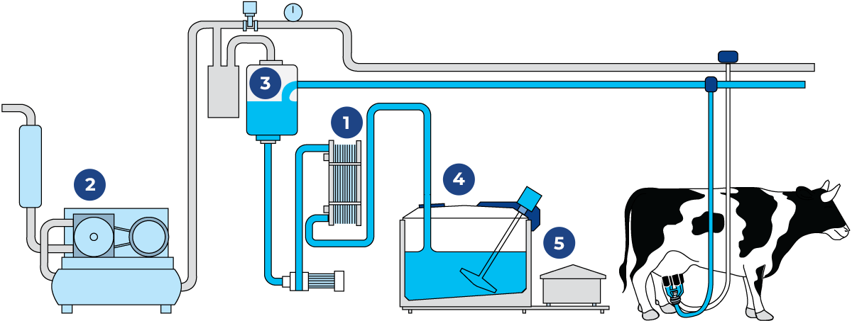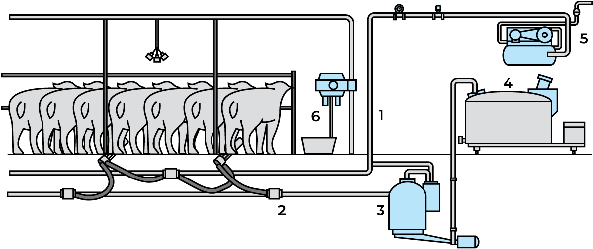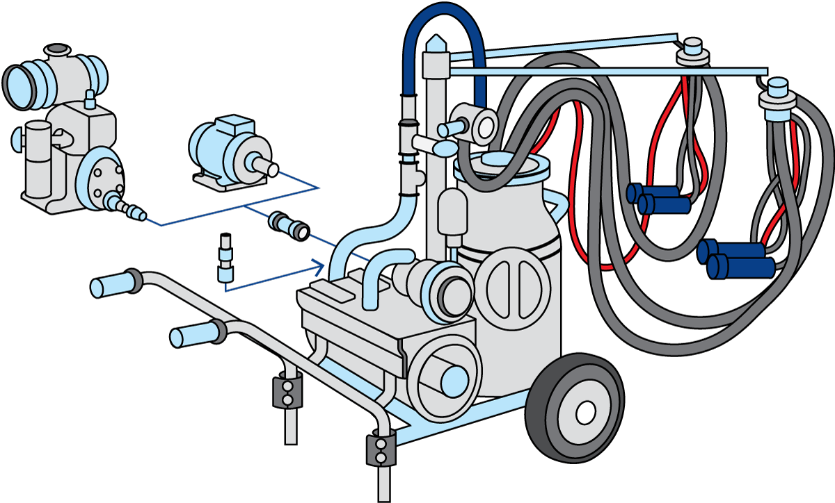 The basic principle of the milking machine is shown in Figure 1.3. The milking machine extracts the milk from the teat by vacuum. A vacuum pump, a vacuum vessel, a vessel for collecting milk, teat cups and a pulsator are all essential parts of the milking machine.