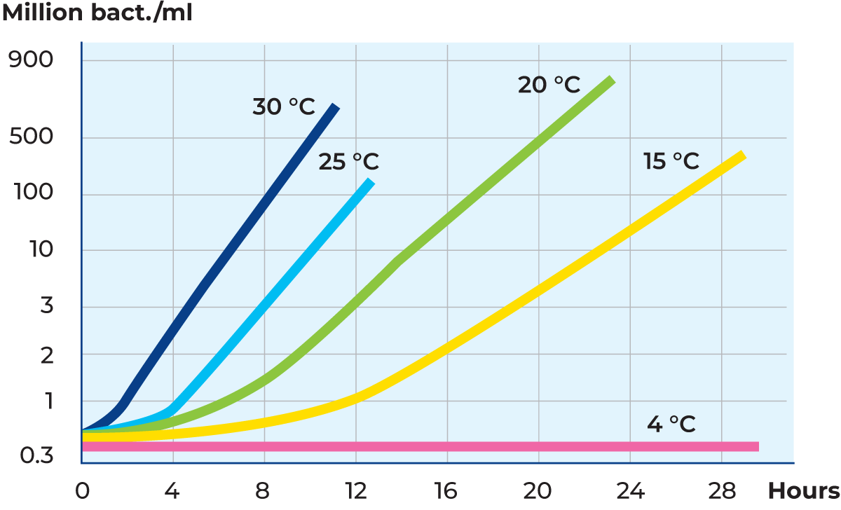 It is important to keep the milk at a low temperature during storage. The activity of the microorganisms will easily increase again if the temperature is allowed to rise a few degrees above the recommended storage temperature. Figure 1.14 shows the rate of bacterial growth at different temperatures over time. Spray or immersion coolers are commonly used on farms, which deliver milk to the dairy in cans. In the spray cooler, circulating chilled water is sprayed on the outsides of the cans to keep the milk cool. The immersion cooler consists of a coil, which is lowered into the can. Chilled water is circulated through the coil to keep the milk at the required temperature.