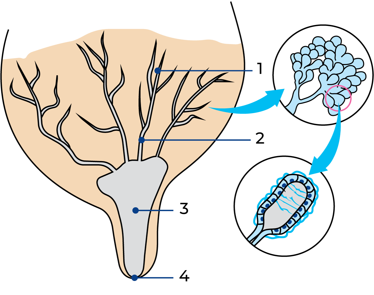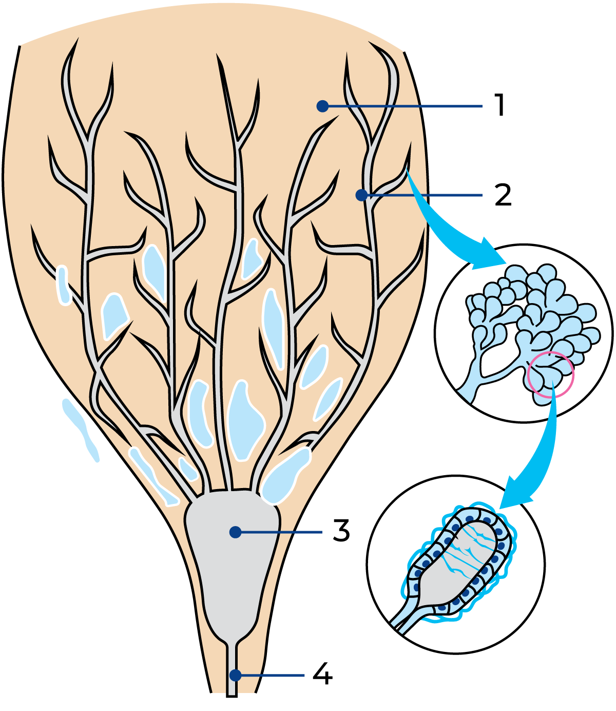 The cow’s udder is composed of glandular tissue containing milk-producing cells. The external layer of this tissue is muscular, thus giving cohesion to the body of the udder and protecting it against injury. The glandular tissue contains around two billion tiny bladders called alveoli. The milk-producing cells are located on the inner walls of the alveoli, which occur in groups of 8 – 120. Capillaries leading from the alveoli converge into progressively larger milk ducts which lead to a cavity above the teat. This cavity, known as the cistern of the udder, can hold up to 20% of the total milk in the udder.