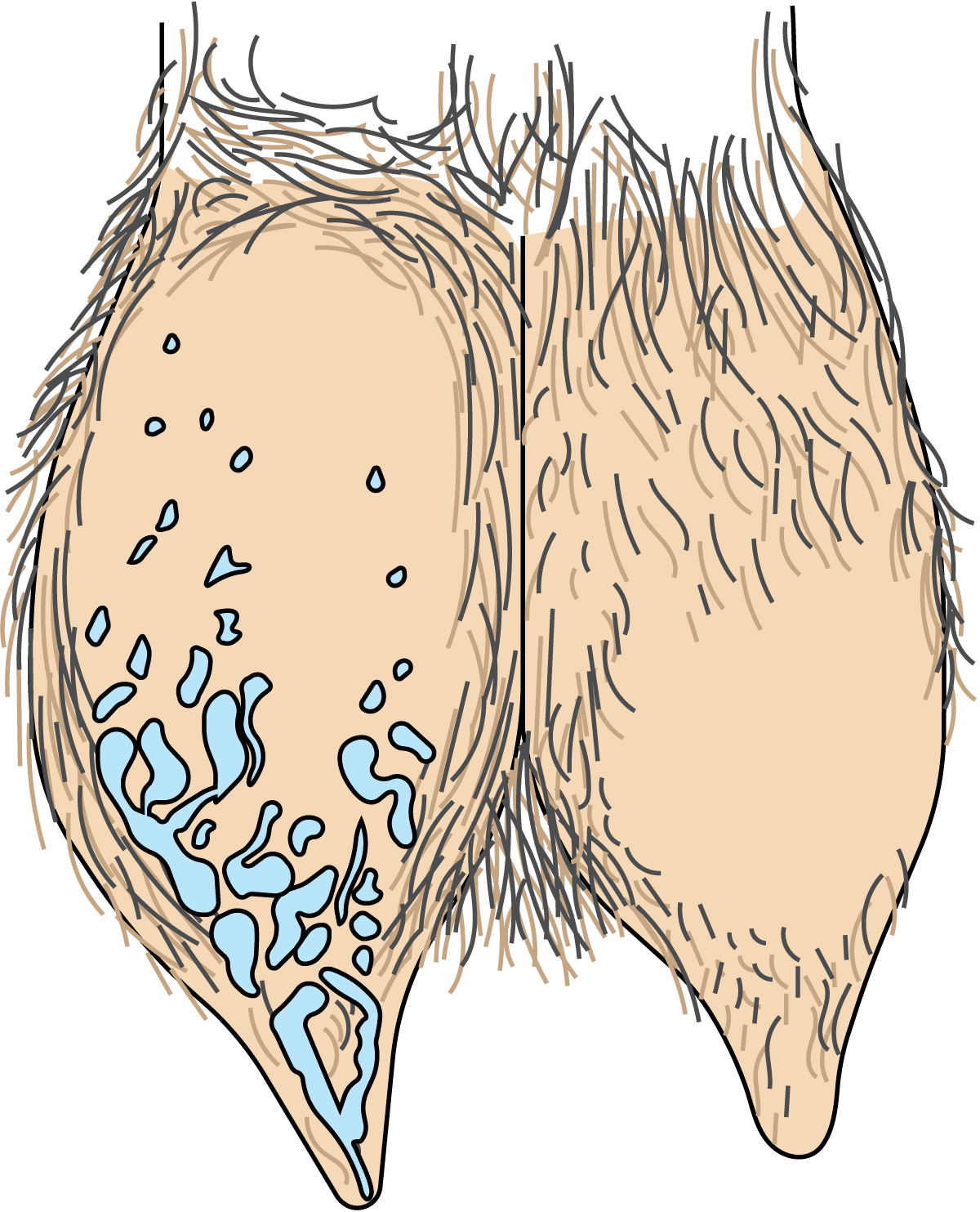 The anatomy of the udder of the ewe is different to that of the cow. The udder of the ewe consists of two halves with one teat each. While the cow is normally easy to milk, both manually and by machine, sheep are more difficult to milk compared to cows, regardless of method. One important reason is that the teats of many ewes are horizontally oriented. An ideal udder is one with the teats at the lowest points of the udder halves. Figure 1.16 shows examples of various udder configurations of sheep.
