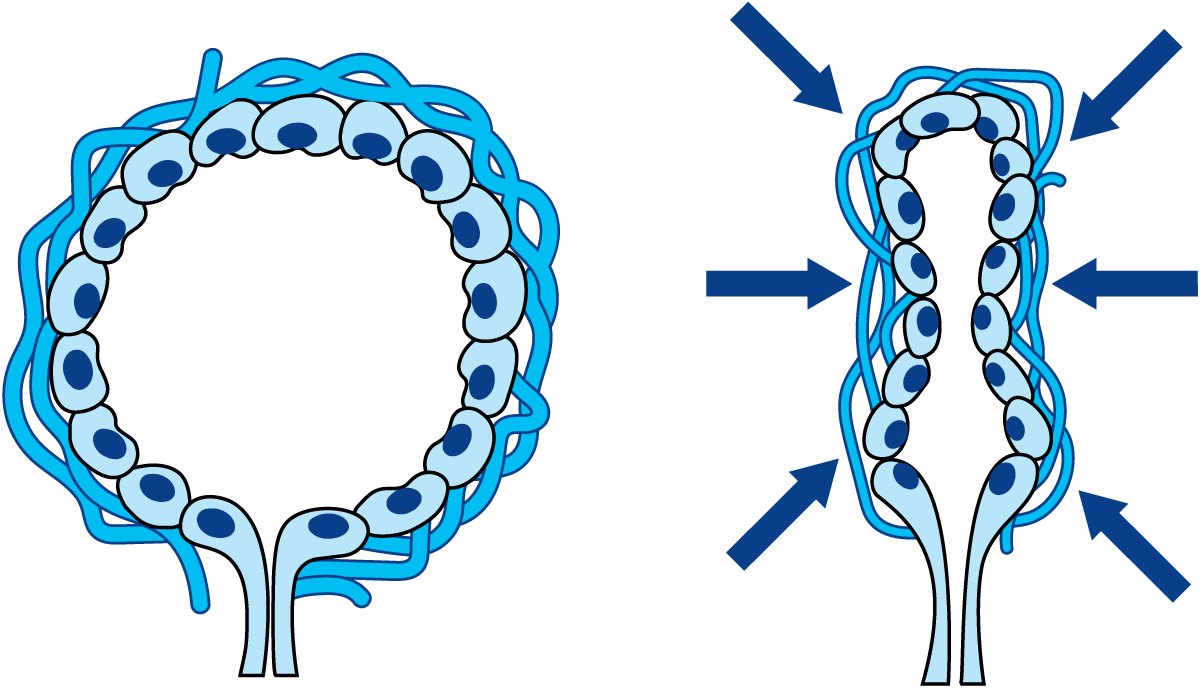 As the alveoli secrete milk their internal pressure rises. If the cow is not milked, secretion of milk stops when the pressure reaches a certain limit. An increase of pressure forces a small quantity of milk out into the larger ducts and down into the cistern. Most of the milk in the udder, however, is contained in the alveoli and the fine capillaries in the alveolar area. These capillaries are so fine that milk cannot flow through them of its own accord. It must be pressed out of the alveoli and through the capillaries into the larger ducts. Muscle-like cells surrounding each alveolus perform this duty during milking (see Figure 1.2).