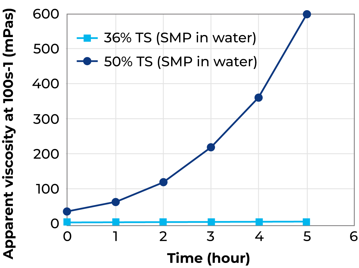 The number of undissolved particles in powder slurry is also dependent on powder concentration. In a highly concentrated slurry (high concentration of milk powder to available water ratio) the likelihood of undissolved particles or particle aggregation and clumping increases. Higher concentrations require more careful management, often involving higher temperatures and extended stirring to minimise undissolved particles. The highest possible safe concentration of skimmed milk powder in water at 48 °C without fast aggregation of particles is 35 – 40% (preferably ≤ 36%). Higher concentrations may lead to protein aggregation and increased viscosity, resulting in gel formation of the slurry. In case there is fat included, it is possible to increase the concentration to 44% where 12.5% comes from the fat.