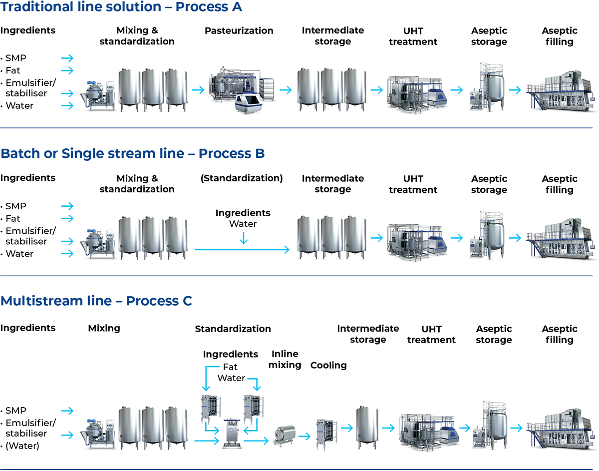 In this technology, the mixing only uses a part of the total water amount, leading to a concentration of all solids (a maximum of 36% in the case of fat-free solids or 44% if 12.5% fat is included). The final product composition is reached through inline dilution with the rest of the necessary water en route to a storage buffer tank or heat treatment. In this way, the number of storage tanks is reduced. The line for UHT milk production is also simplified by removal of the pasteurization step.