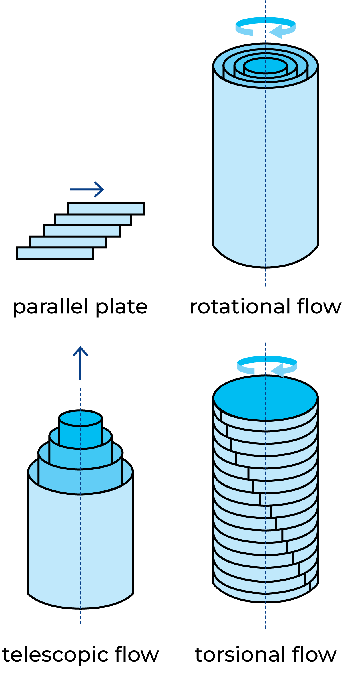 In rheology, the shearing of a substance is key to knowledge of flow behaviour and structure. Different types of shearing are shown in Figure 3.1. A sheared flow is achieved through flow between parallel planes, rotational flow between coaxial cylinders where one cylinder is stationary and the other one is rotating, telescopic flow through capillaries and pipes, and torsional flow between parallel plates.