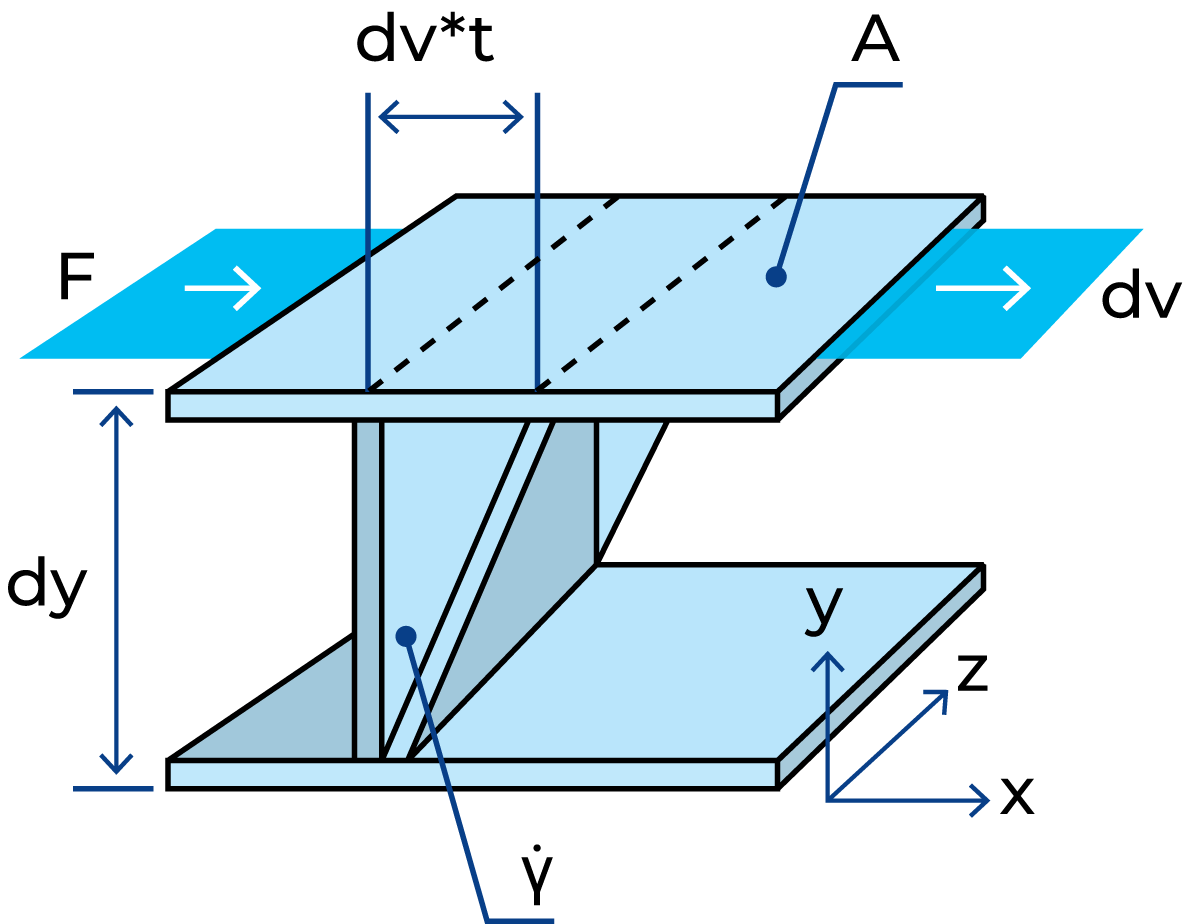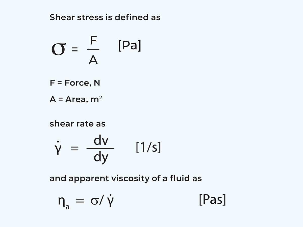 Shearing between parallel planes is normally used for the basic definition of shear stress and shear rate, shown in Figure 3.2, corresponding to how much deformation is applied to the material and how fast. When an external force (F) is acting on a unit area (A) it will create shear flow and its resistance provides the shear stress. How fast the fluid layers move will provide the shear rate. Then the proportionality coefficient between shear stress and shear rate is defined as the apparent viscosity.