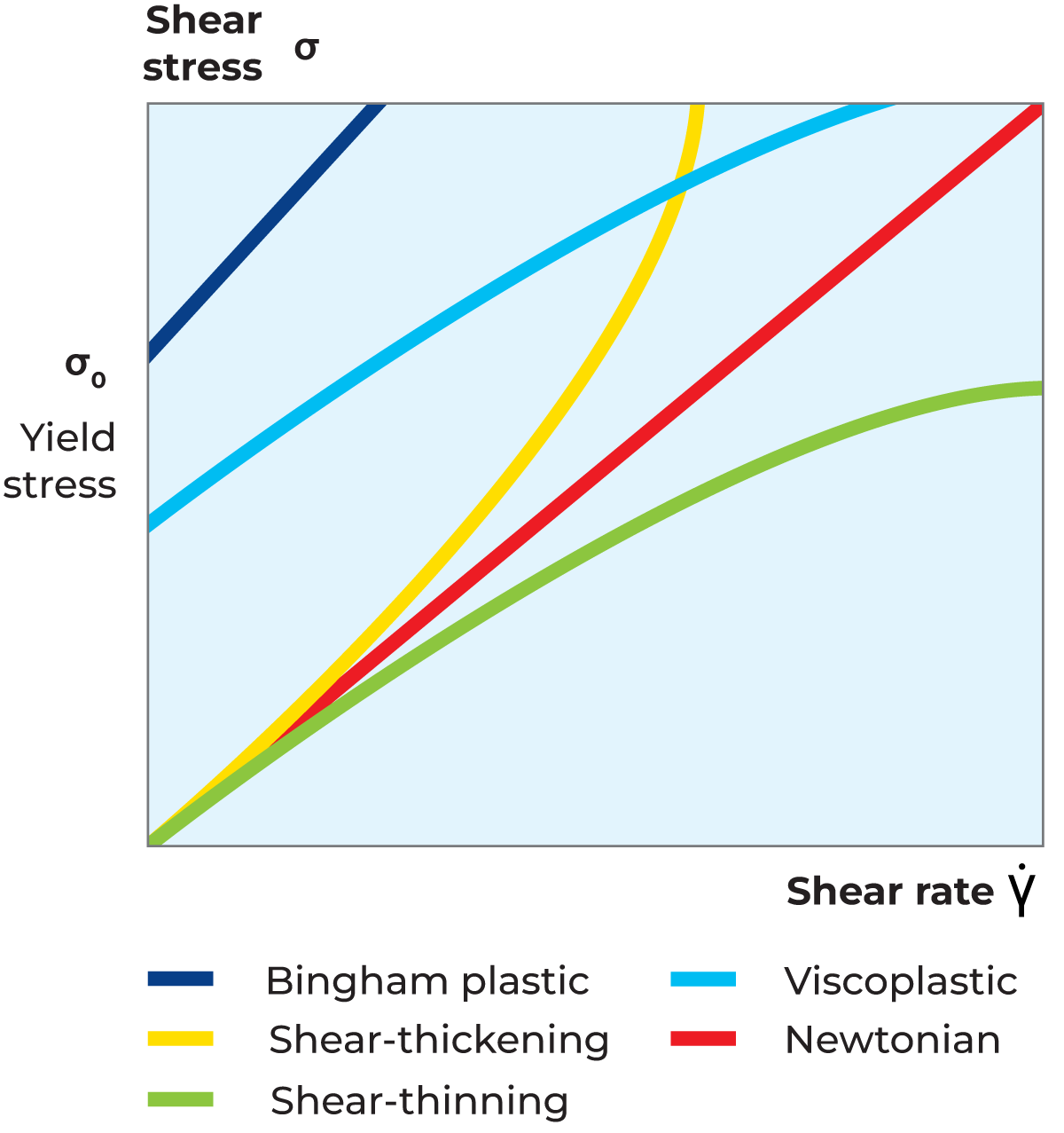 A fluid that exhibits a yield stress is called a plastic fluid. The practical result of this type of flow behaviour is that a significant force must be applied before the material starts to flow like a liquid. This is often referred to as 'the ketchup effect'. If the force applied is smaller than the force corresponding to the yield stress, the material stores the deformation energy, i.e. shows elastic properties and hence behaves as a solid. Once the yield stress is exceeded, the liquid can flow like a Newtonian liquid and be described as a Bingham plastic liquid, or it can flow like a shear-thinning liquid and be described as a viscoplastic liquid. Both Bingham and viscoplastic curves are shown in Figure 3.3 and Figure 3.4. Typical plastic fluids are quark, high-pectin pineapple juice concentrate, tomato paste and certain ketchups. Outside the liquid food world, toothpaste, hand cream and greases are typical examples of plastic fluids.