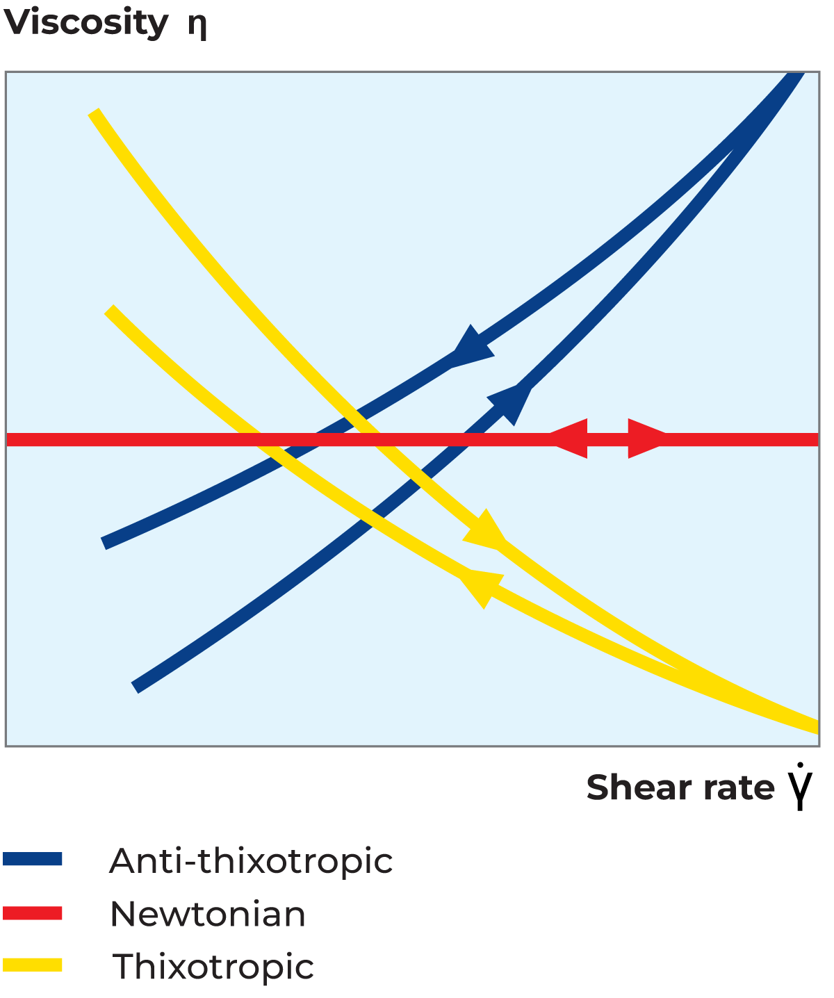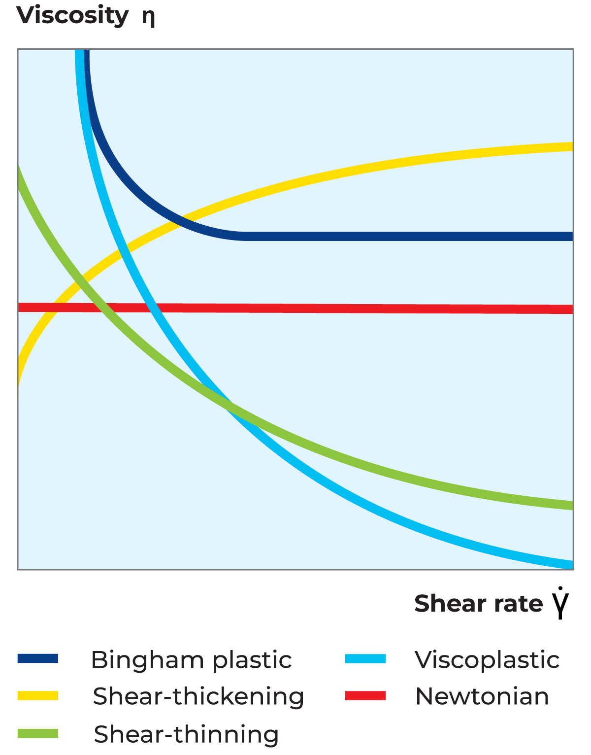 Materials which cannot be defined by a single viscosity value at a specified temperature are called non-Newtonian. The viscosity of these materials must always be stated together with a corresponding temperature and shear rate. If the shear rate is changed, the viscosity will also change. Generally speaking, high concentrations and low temperatures increase non-Newtonian behaviour.