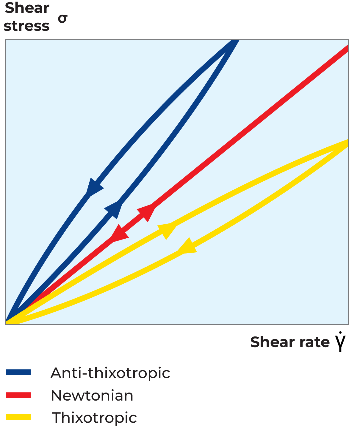 A thixotropic fluid can be described as a shear-thinning system where the viscosity decreases not only with an increasing shear rate but also with time at a constant shear rate. Thixotropic flow behaviour is normally studied in a loop test. In this test, the material is subjected to increasing shear rates followed by the same shear rates in decreasing order, as shown in the flow curve in Figure 3.5 and the viscosity curve in Figure 3.6. The time-dependent thixotropic flow behaviour is seen from the difference between the ascending and descending viscosity and shear stress curves. To recover its structure, the material must rest for a certain period of time which is characteristic of the specific material. This type of flow behaviour is shown by all gel-forming systems. Typical examples of thixotropic fluids are yoghurt, mayonnaise, margarine, ice cream and brush paint.