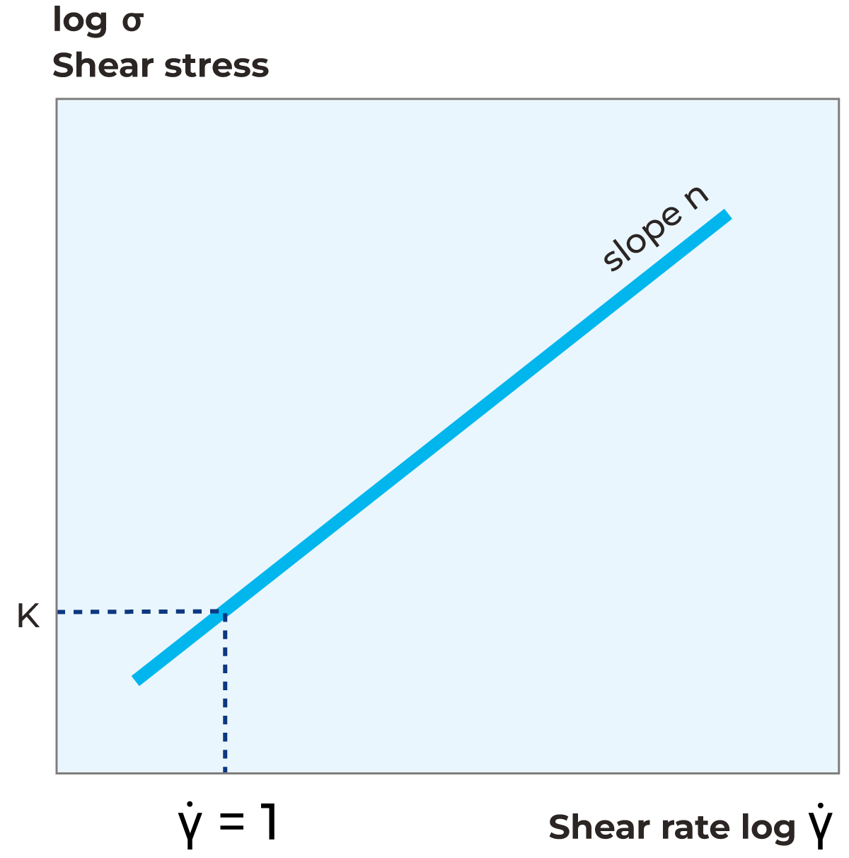 Figure 3.7, demonstrates how to calculate both the consistency coefficient (K-value) as well as flow behaviour index from a flow curve. The flow behaviour index (n-value) is calculated from the slope of the flow curve and the consistency coefficient is calculated as shear stress value when shear rate is equal to 1.