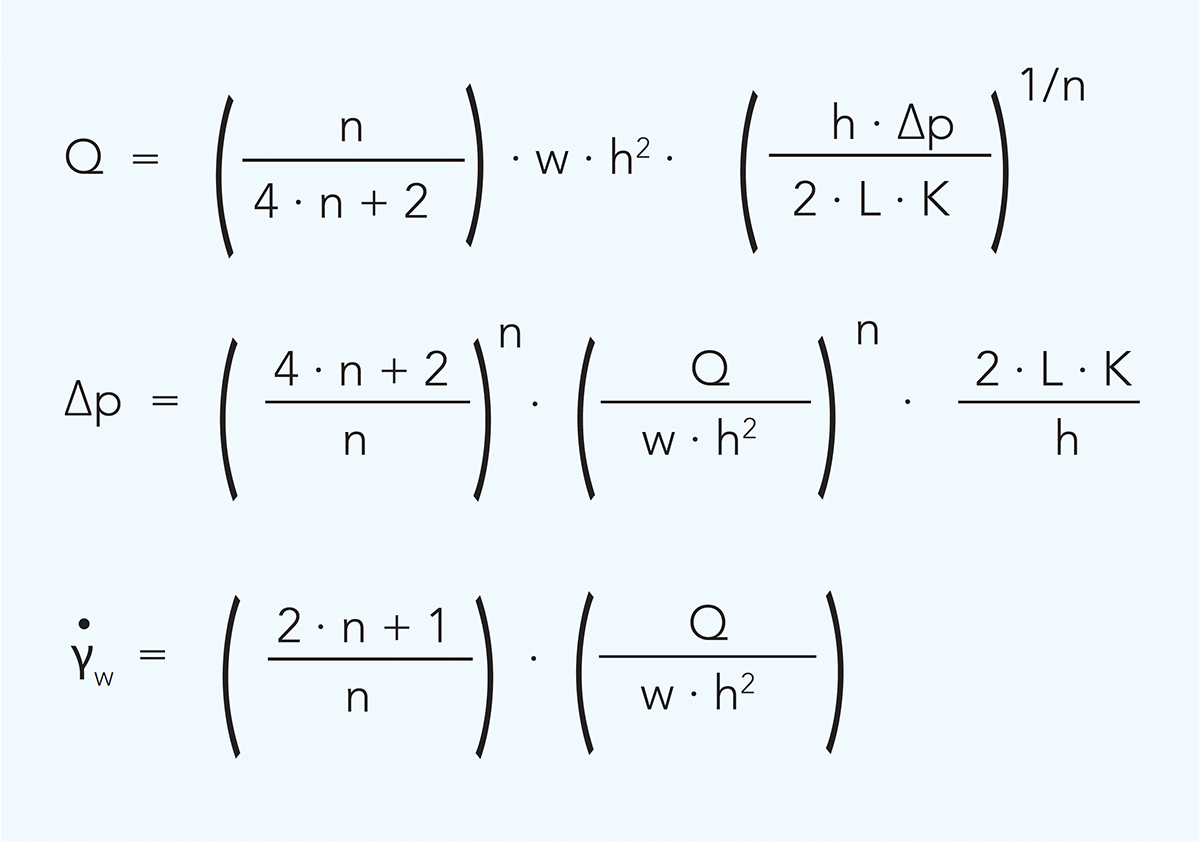 Some useful equations are given below for the manual calculation of pressure drop and shear rates for flow in circular and rectangular channels. All equations are based on the power law expression, as most food systems in processing conditions can be described by this expression.