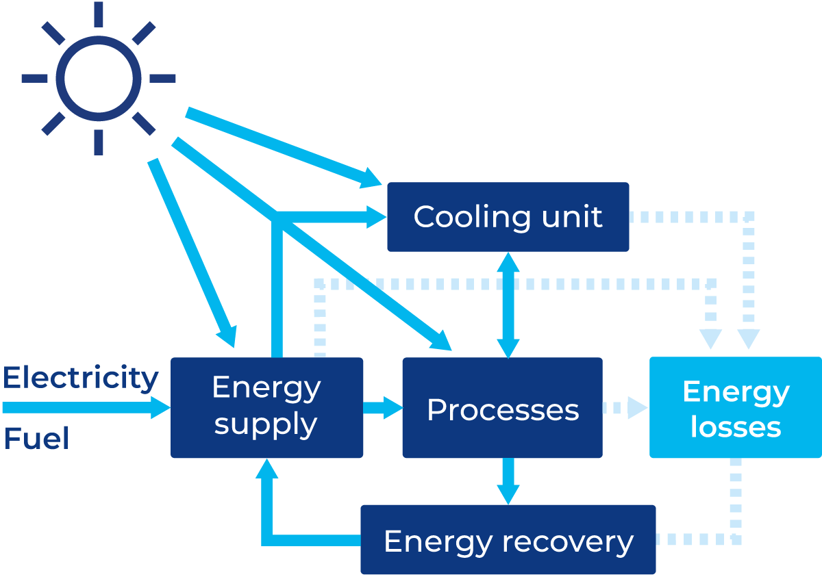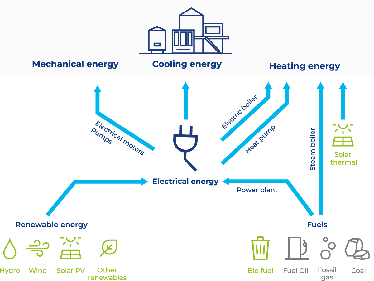 The transition from fossil fuels and conventional energy sources to renewable energy is advancing at different speeds across the globe. As part of this shift, many companies are adopting hybrid systems, integrating both renewable and conventional technologies to optimise energy use and ensure reliability. Fossil-based technologies are often retained as a backup option to meet peak power demands or provide stability during high load periods. To further enhance energy efficiency and minimise carbon emissions, companies can implement heat pumps, energy storage systems, and energy management strategies.