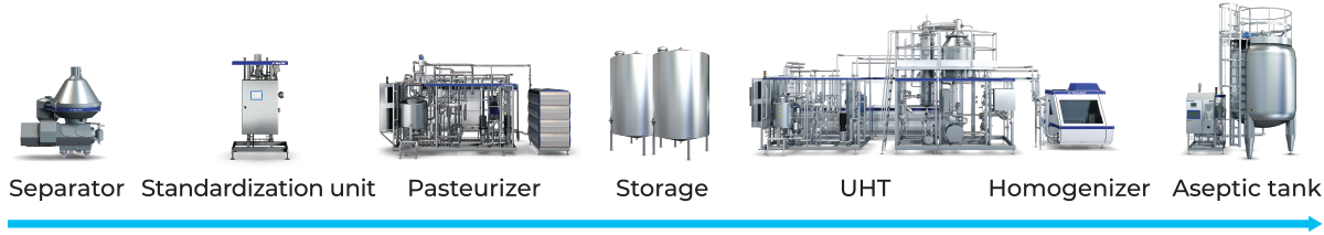 It is based on continuous processing in one go from raw milk through preheating, separation, standardization, homogenization and UHT heat treatment to aseptic storage of the final product UHT milk.
