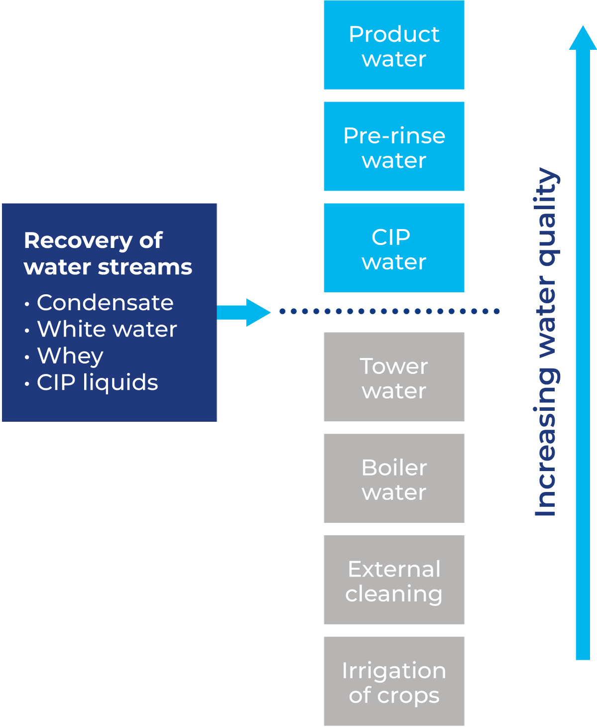 When the above steps are taken to recover water, it is important to find a suitable use for the water in the processing plant. This depends on the level of water quality needed for certain applications. Even if the quality of the recovered water meets technical requirements, there may be hindrances to meeting legislation and other requirements in food production regulations. The legislation and directives can vary in different countries and must be investigated. For example, water that is in contact with the product has to meet stricter requirements as set by local legislation. As shown in Figure 8.4.9, examples include product water (quality equal to potable water), pre-rinse water when starting up processing, and CIP water for cleaning the equipment. Alternatively, water that is not in contact with the product can be of lower quality. Examples include water used for cleaning the factory, boiler water, and tower water for cooling.