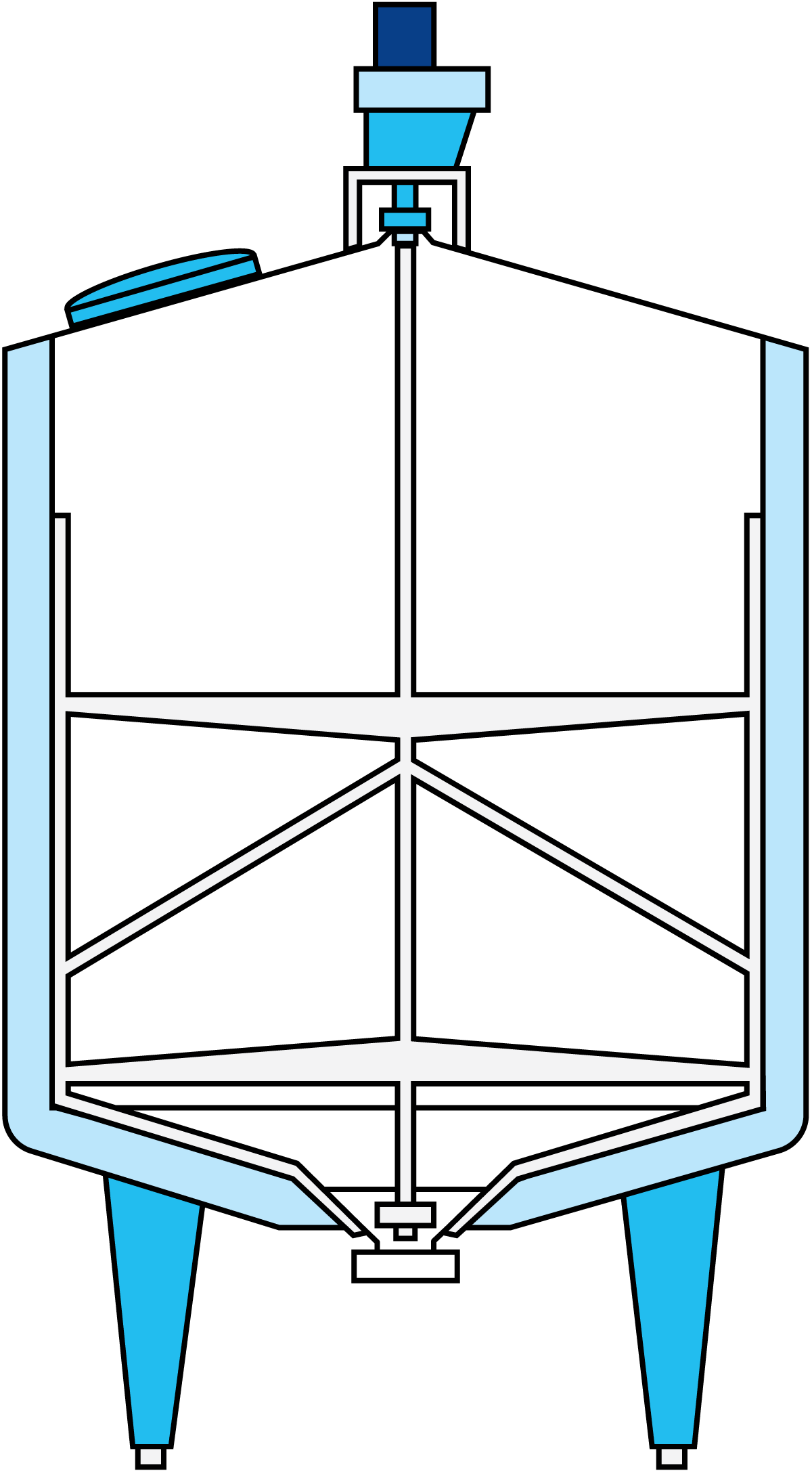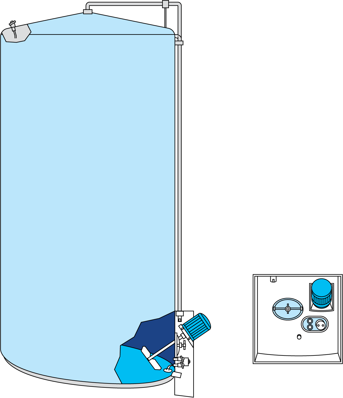 The storage tank has an agitator and can be fitted with various components and systems for cleaning and for control of level and temperature. This equipment is basically the same as previously described for silo tanks.