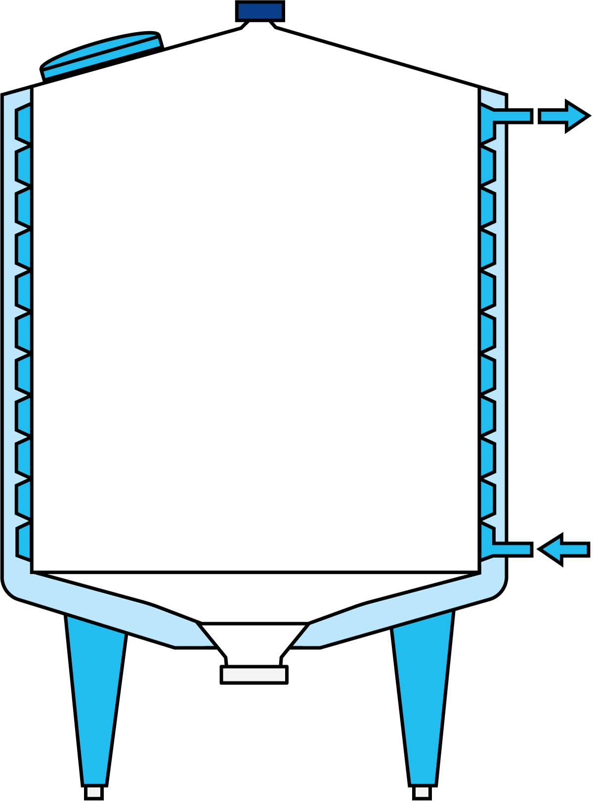 In storage tanks (Figure 7.10.3) with a capacity of 1,000 to 80,000 litres, the inner shell is made of stainless steel. Depending on the location of the storage tank in the process, the tank is insulated, fitted with dimpled jackets, channels or atmospheric jackets, or both cooling applications and insulation to maintain a constant product temperature. In this case, the outer shell is also of stainless steel, and there is a layer of mineral wool between the shells.