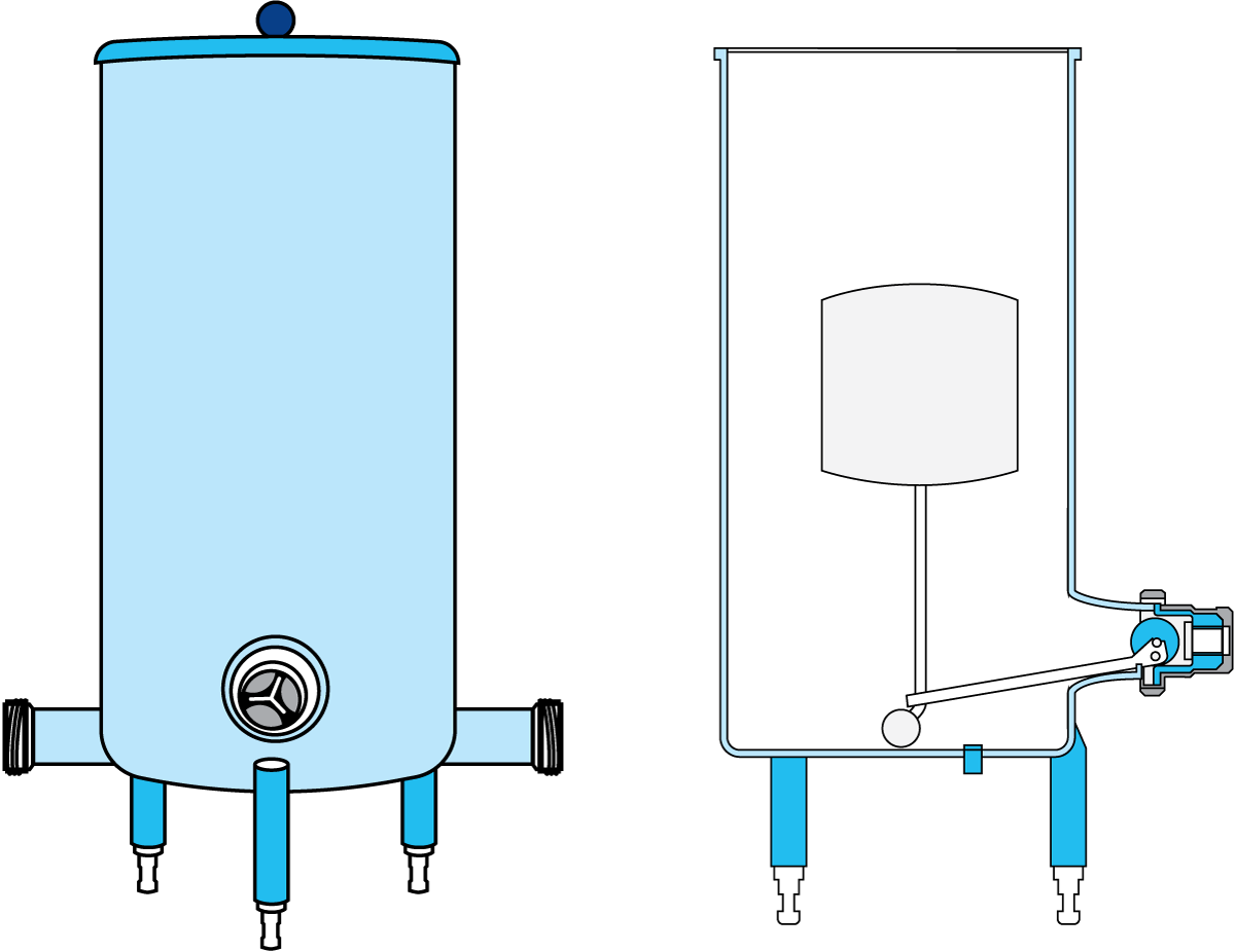 If the pump draws more from the tank than flows in at the inlet, the level drops and the float with it. The valve opens and lets in more liquid. In this way, the liquid in the tank is kept at a constant level. Today the same functionality is usually achieved with level sensors that control a regulating valve.