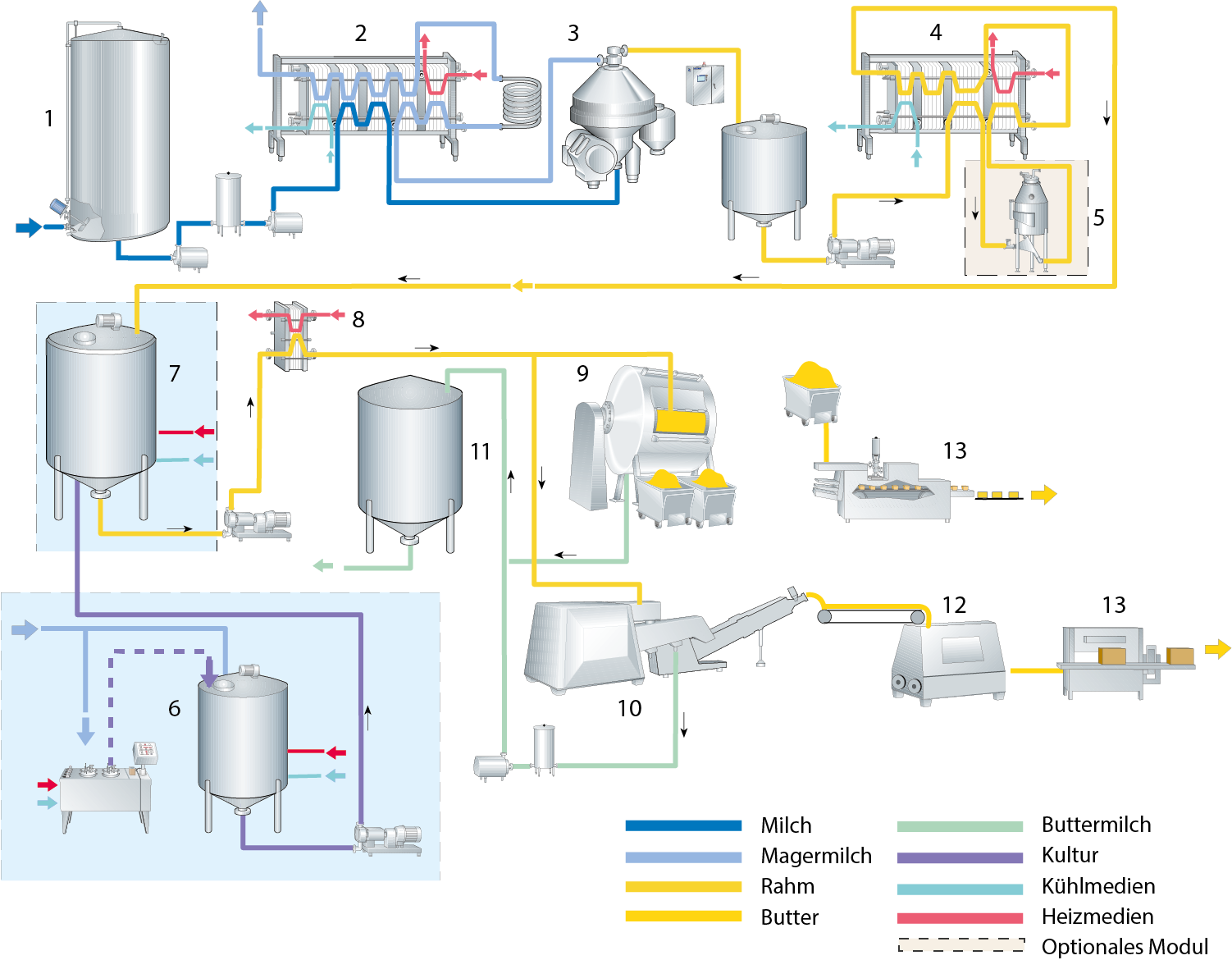 Die heutige Butterproduktion basiert auf Wissen und Erfahrungen, die über Jahre hinweg im Bereich Hygiene, mikrobiologische Fermentation und Temperaturbehandlung gewonnen wurden, aber auch aus dem raschen technischen Fortschritt, der zu den heute verwendeten hochentwickelten Butterungsmaschinen führte.