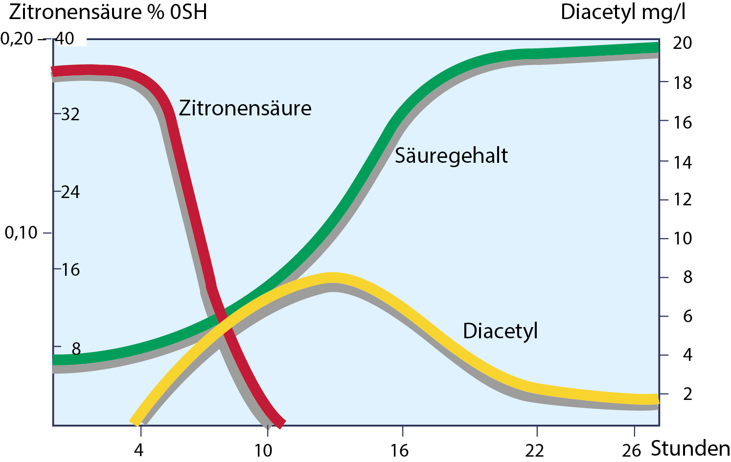 Eine langsame Säuerung ist charakteristisch für die erste Wachstumsphase. In dieser Phase sind die Fermentation von Zitronensäure und die Diacetylbildung noch relativ unbedeutend. Die Säurebildung beschleunigt sich in der Folgephase sehr schnell, wenn die Fermentation von Zitronensäure zu Diacetyl erfolgt. Der weitaus größte Teil des gebildeten Diacetyls wird von den Aromabildnern reduziert.