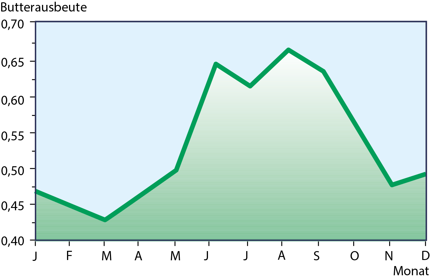 Die Kurve in Abb. 12.5 zeigt, wie sich die Butterausbeute über das Jahr hin ändern kann. Der Buttermilchfettgehalt ist im Sommer am höchsten.