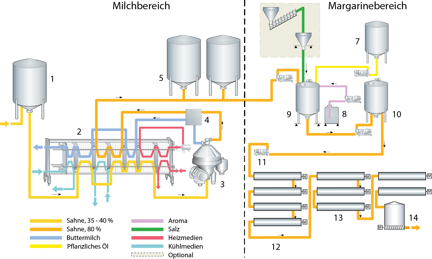 Ausgangsstoff ist Rahm mit 35 bis 40 % Fett. Da der Rahm aus einer anderen Molkerei oder einem Stapeltank vor Ort stammen kann, muss er auf 60-70 °C erhitzt werden, bevor er in den Rahmkonzentrator, eine hermetische Zentrifuge, gelangt. Der Konzentrationsgrad, d.h. der Rahmfettgehalt, wird über eine wie in Kapitel 6.2 beschriebene kontinuierliche Standardisierung automatisch eingestellt. So können Fettgehalte bis 82 % erreicht werden (in speziellen Fällen bis zu 84 %, dann allerdings einhergehend mit einem hohen Fettgehalt der mageren Phase von über 10 %). Nach der Fettstandardisierung wird der Rahm auf 18-20 °C gekühlt, bevor er in den Verweiltank/Vorkristallisationstank gelangt. Margarinebereich (rechts der gestrichelten Linie in Abb. 12.8)