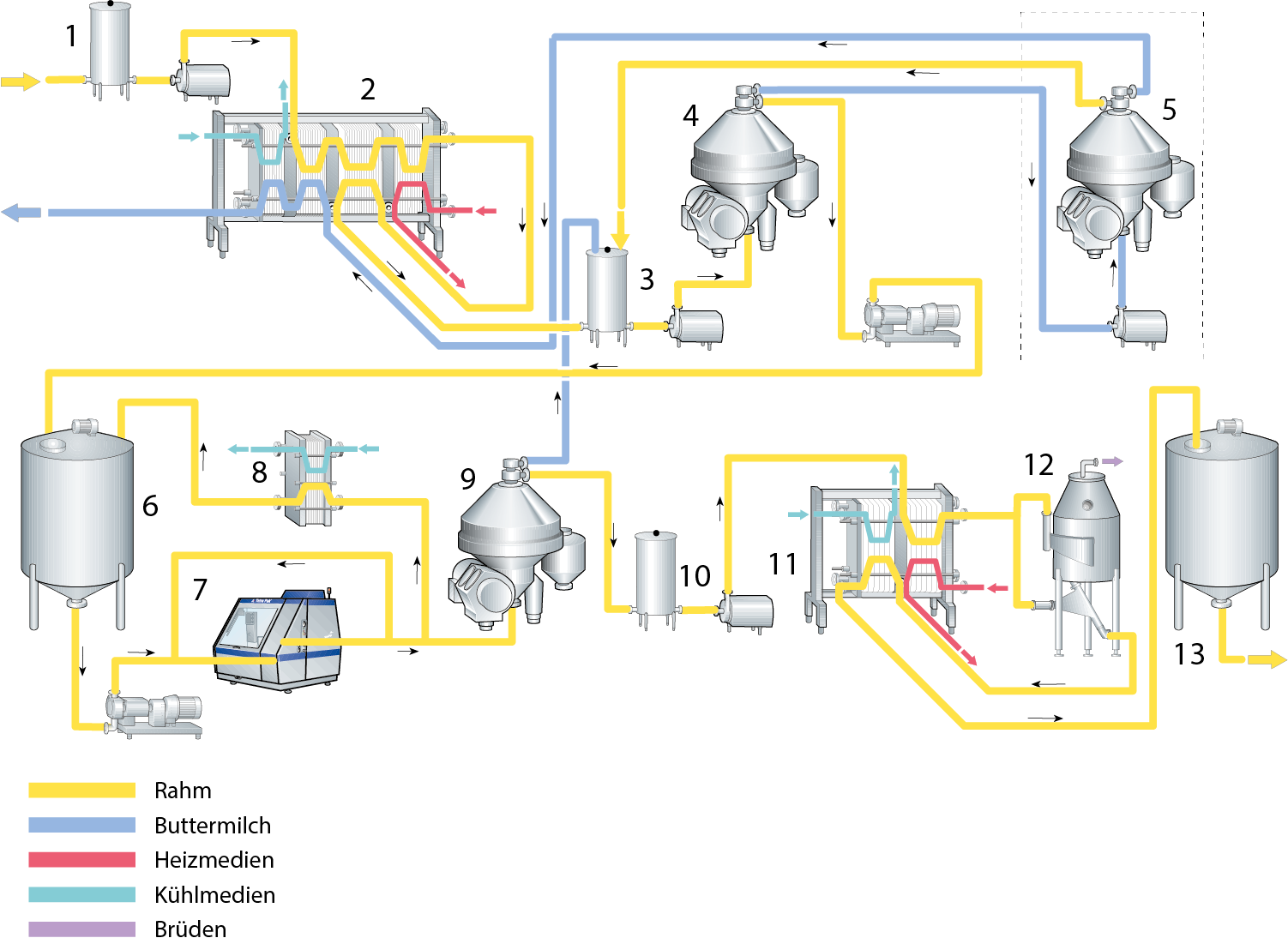 Abb. 13.2 zeigt eine Produktionslinie zur Herstellung von AMF aus Sahne. Pasteurisierte oder unerhitzte Sahne mit 35-40 % Fett gelangt aus dem Vorlaufbehälter (1) in die Linie und wird in einem Plattenwärmeaustauscher (2) vorgewärmt oder pasteurisiert und anschließend auf den Separator (4) geleitet. Hier erfolgt die Vorkonzentration auf ca. 75 % Fett. Die Temperatur während der Vorkonzentration beträgt bis zum Erreichen des Plattenwärmeaustauschers (11) etwa 60 °C. Die "leichte" Phase wird in einem Sammeltank (6) zur Weiterverarbeitung aufgefangen, die "schwere" Phase, meist als Buttermilch bezeichnet, kann durch einen Separator (5) geleitet werden, um Fett rückzugewinnen, das in die zulaufende Sahne (3) gemischt wird. Die entrahmte Buttermilch geht zur Wärmerückgewinnung zurück zum Plattenwärmetauscher (2) und danach in einen Lagertank.