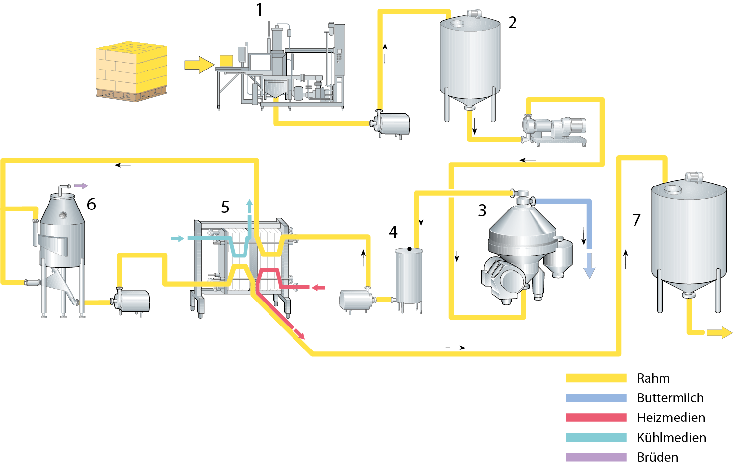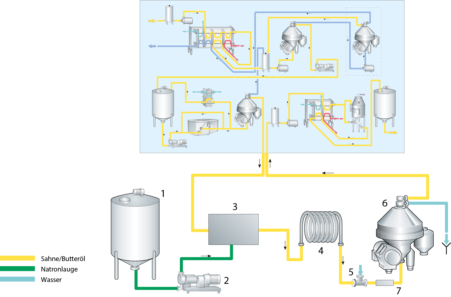 wird das Produkt zum Hochkonzentrator gepumpt (3). Danach wird die leichte Phase mit 99,5 % Fett zu einem Plattenwärmetauscher (5) gefördert und auf 90–95 °C erhitzt. Von dort wird sie in einen Vakuumbehälter (6) weitergepumpt. Anschließend erfolgt im Plattenkühler (5) die Kühlung auf eine Abpacktemperatur von etwa 40 °C. Die schwere Phase kann in einem Buttermilch- oder Restetank gesammelt werden, abhängig davon, ob es sich um ein "reines" Produkt handelt, oder ob es mit einem Neutralisationsmittel behandelt wurde. Wird die Butter aus einem kontinuierlichen Butterfertiger zugeführt, besteht dasselbe Risiko, ein trübes Öl zu erhalten, wie bei der bereits erwähnten Verwendung frischer Butter. Ist der Endkonzentrator hermetisch ausgelegt, kann der Füllstand in der Maschine so eingeregelt werden, dass man eine helle Ölphase mit 99,5 % Fett in einer etwas niedrigeren Menge und eine schwere Phase mit relativ hohem Fettgehalt (ca. 7 %) in einer etwas höheren Menge erhält. Die schwere Phase sollte erneut separiert und die erhaltene Sahne rezirkuliert werden, indem man sie in den Zulauf der Butterungsmaschine einmischt.