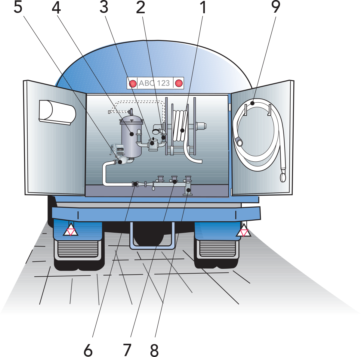 Ein solches System (Wedholms, Schweden) wird in Abb. 6.6.2 dargestellt. Die Pumpeinrichtung ist in einem Schrank an der Rückseite des Tanksammelwagens untergebracht. Das System filtert, pumpt, scheidet Luft ab und misst das Volumen der Milch, bevor sie in die Tankkammern gelangt.