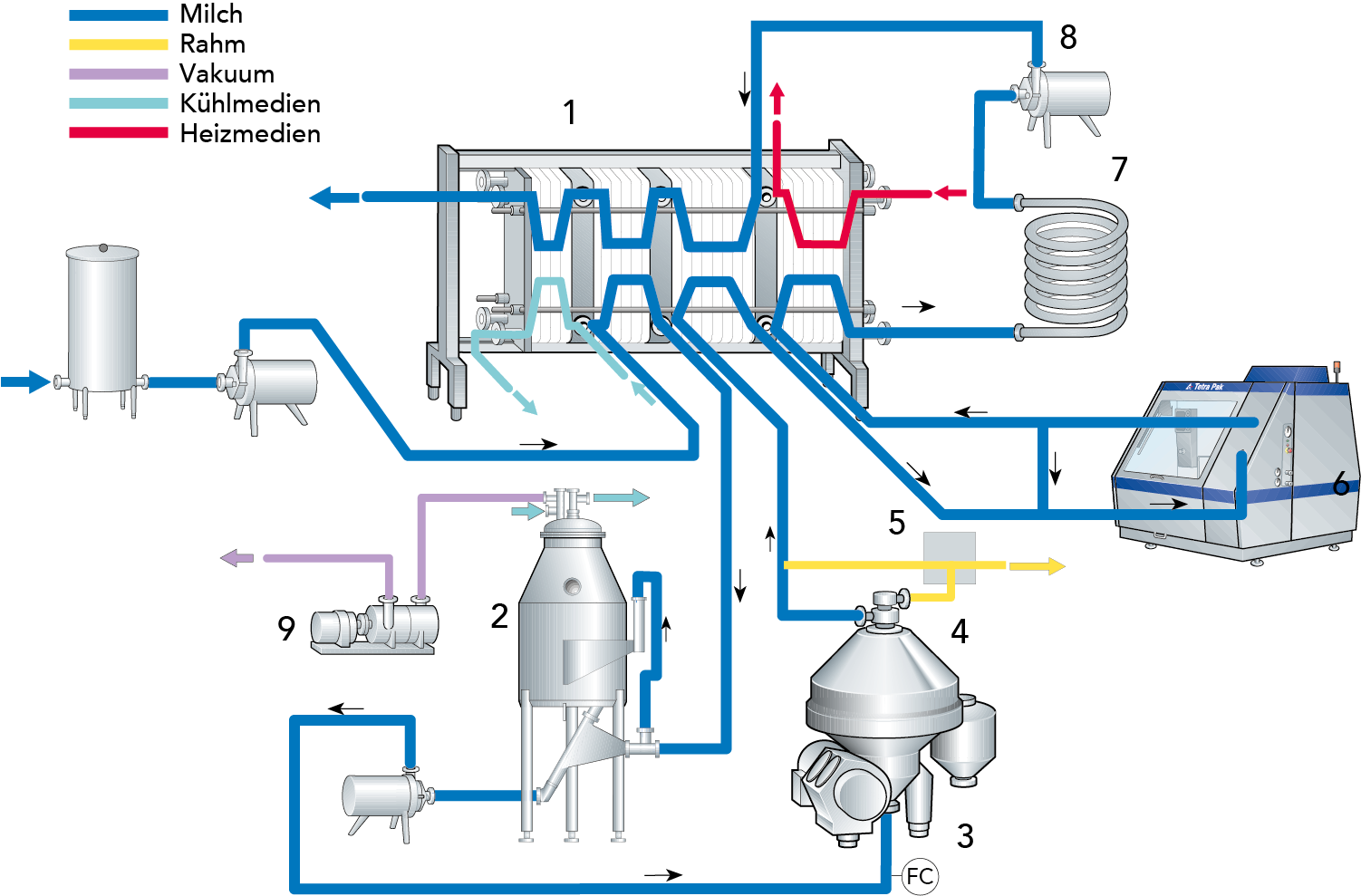 Vollmilch wird dem Pasteur zugeleitet und auf 68°C erhitzt. Sie fließt danach zur Vakuumentgasung in den Ausdehnungsbehälter. Um die Effizienz der Entgasung zu optimieren, tritt die Milch durch ein breites tangentiales Einlaufrohr in den Vakuumbehälter ein, wodurch ein dünner Flüssigkeitsfilm an der Wandung gebildet wird. Durch Ausdehnung der schlagartig abgedampften Brüden aus der Milch am Einlauf wird gleichzeitig auch die Fließgeschwindigkeit der Milch an der Wandung erhöht.