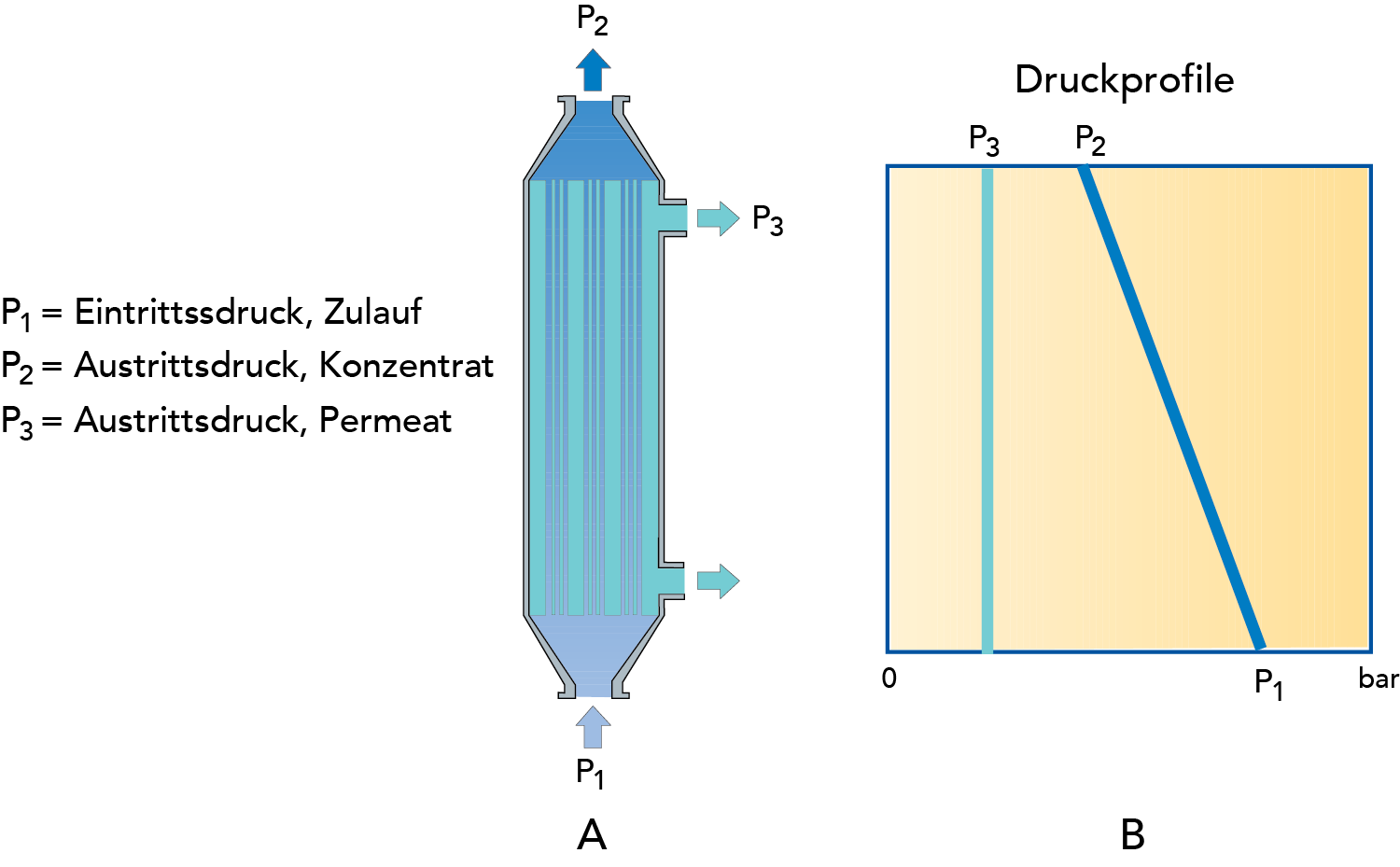 Je größer die Strömungsgeschwindigkeit im Modul ist, desto größer wird der Wert für P. Eine höhere Geschwindigkeit führt zu einer größeren Scherwirkung auf der Membranoberfläche und einem geringeren Polarisationseffekt. Es bestehen jedoch Beschränkungen, wie z. B. der Druckwiderstand der Membran und die Investitions- und Betriebskosten für die Pumpen, die sowohl hohen Durchfluss als auch hohen Druck liefern müssen. - Dem Transmembrandruck (TMD), der als Druckverlust zwischen Retentat- und Permeatseite der Membran an einem bestimmten Punkt entlang der Membran bezeichnet wird. Bei der Effizienz eines Membransystems wird als Hauptkriterium der Flux erfasst, der als Funktion des TMD in Durchfluss je Membranflächeneinheit und Stunde l/m2/h gemessen wird.