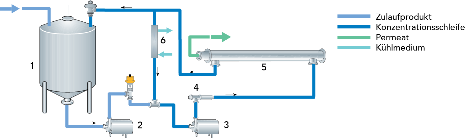 Wie bereits erwähnt, basiert die MF auf zwei Filtermodulen, die in einem Filterschleifensystem in Serie betrieben werden, wobei je eine Kreiselpumpe für die Zirkulation von Retentat bzw. Permeat sorgt.