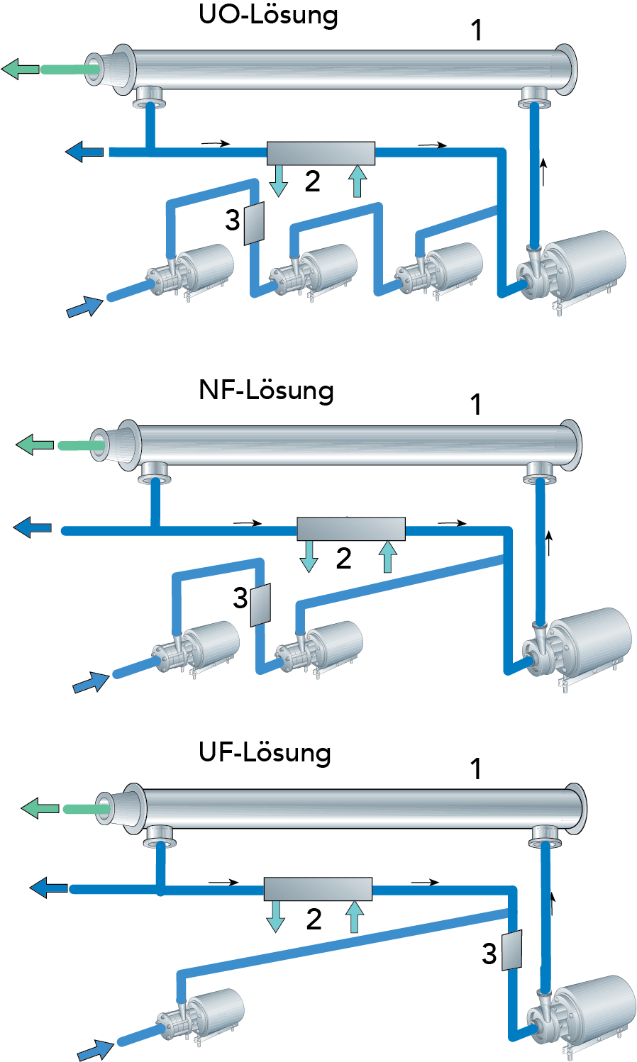 Die beiden anderen Filtrationsanlagen, NF und UF, haben weitere Mem- branporen und kommen daher mit zwei bzw. einer Förderpumpe aus.